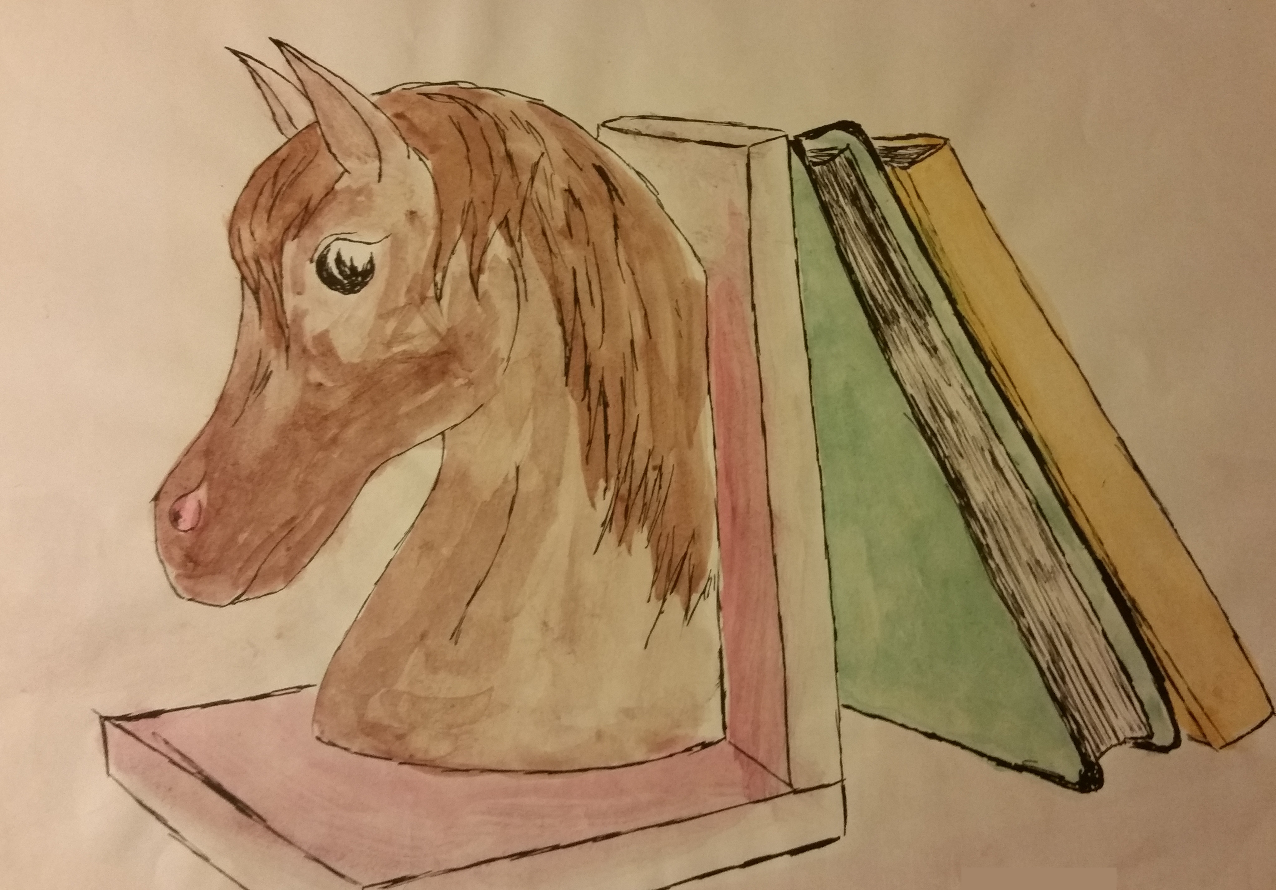 Water Color – I also experimented with adding life to drawings by using water color.  Don’t look too closely at this horse-head bookend picture because I accidentally gave the poor pony severe-plaque psoriasis with watercolor, something I wouldn’t wish even on a horse made out of plaster or stoneware.  Water color is difficult for me because I am highly controlled when I draw.  I do not like the many “happy accidents” of the water-color world.  I do not adapt well to runny color.  So, water color also became a NO for me in high school.