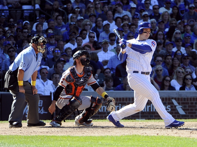 Sep 2, 2016; Chicago, IL, USA; Chicago Cubs first baseman Anthony Rizzo (44) hits a double against the San Francisco Giants during the eighth inning at Wrigley Field. Mandatory Credit: David Banks-USA TODAY Sports