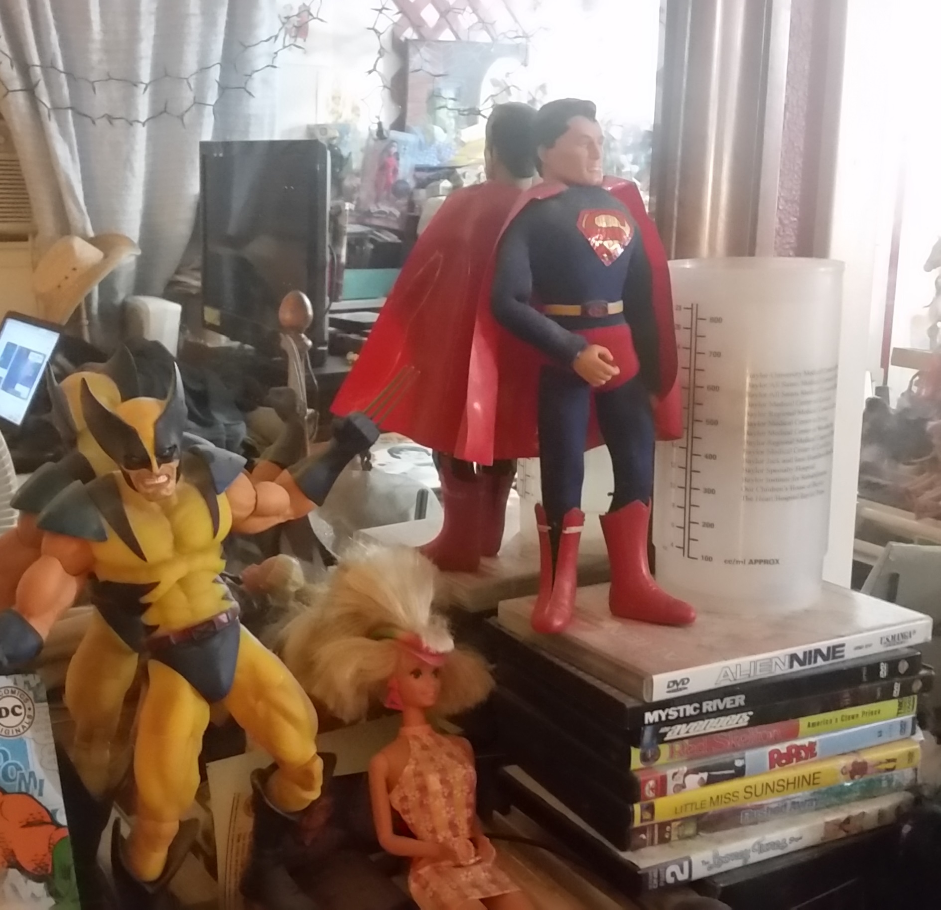 At that time my wife noticed that I still had my childhood action figures and occasionally worked on restoring them. At the time those particular toys were hot collector’s items. With the internet came E-Bay, and with E-Bay came the power to find and collect old toys that were rising in value daily. Derfy nutcases like me were willing to spend actual money to revisit the toys of our youth. I bought things like the Captain Action vintage Superman costume, seen in my bedroom next to my hospital cup. My wife started the whole Barbie craze by buying some for herself and starting me on a downward spiral of me buying old and new Barbie dolls for her. That’s when the doll collection spiraled out of control. I did manage to sell some here and there and make a bit of money, but eventually, the collectors’ market dried up as nerdy derfs managed to spend all their money on dolls and couldn’t buy more.