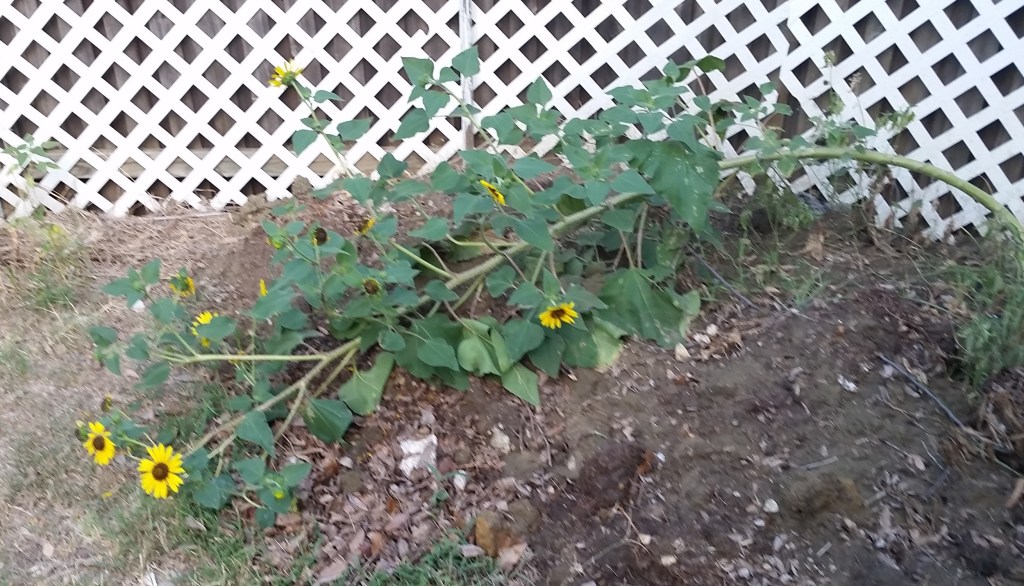 My summer sunflower, the one that came up voluntarily in the pile of extra dirt left behind by the re-setting of the retaining wall around our yard, a DIY project for 2019, had dropped over from lack of water while we were gone to Iowa and attending the funeral. I thought it was going to die.
