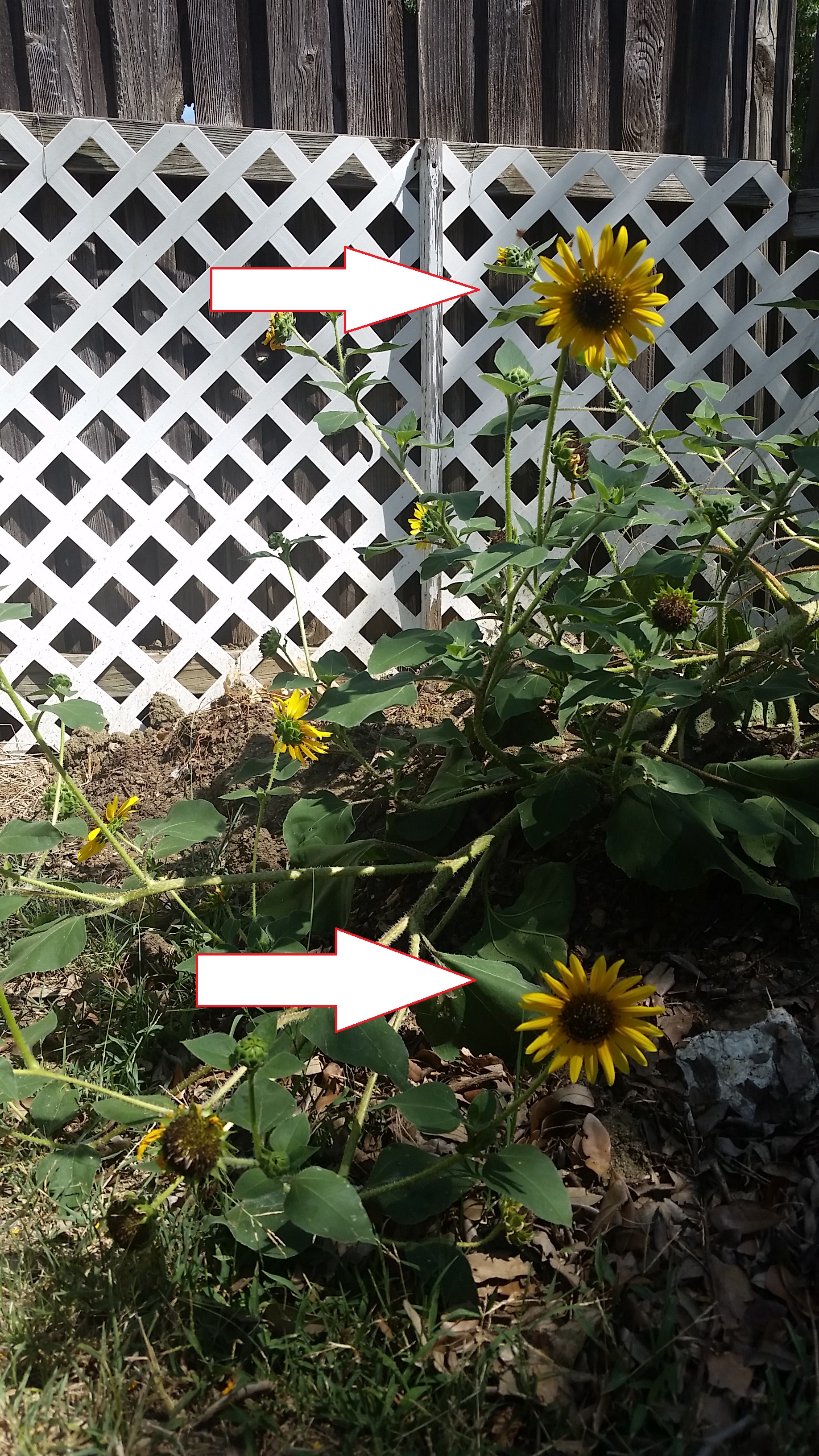 Watering the sunflower’s sad remains twice a day has yielded two new large and healthy blossoms growing upward from the decimated stalk.