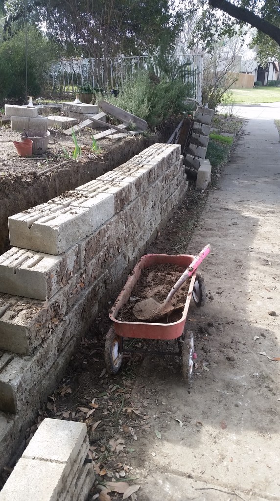 I finished re-building the retaining wall in our yard today. A two-year project coming to an end. But someone working on the road maintenance crew came back one night after work and stole about ten bricks. The compromises I had to make will leave the job permanently unfinished.