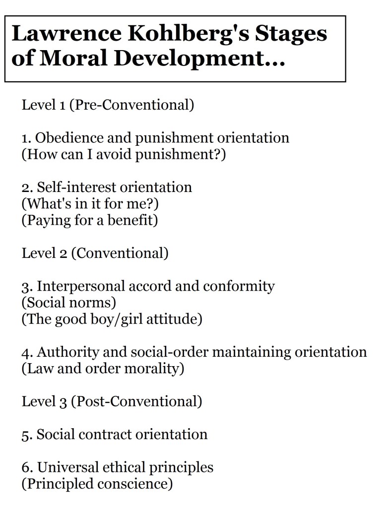 Here’s the science behind what I am saying represented by Kohlberg’s published Stages of Moral Development, a theory backed by numerous replicated studies.