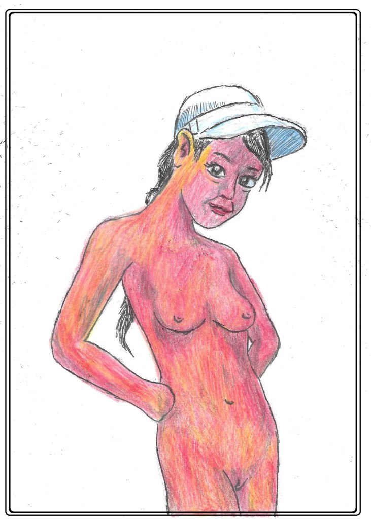 A portrait of a young nudist friend, in pen and ink, and later color.