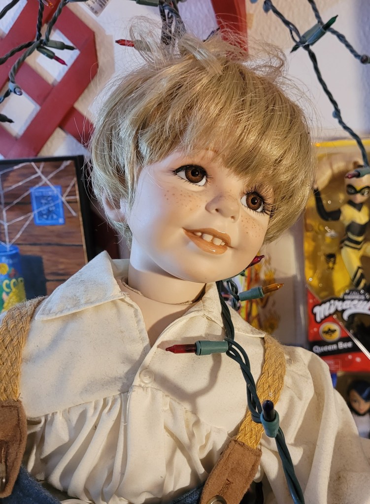 I bought her after my mother died. My mother loved dolls. She made them in the kiln that she and I bought together in 1994. She made them out of porcelain. Bought the greenware and fired it. Learned how to pour porcelain into the molds she bought. Painted them and made clothes for them. She made beautiful dolls… beautiful works of art. Two of them she made for me, Tom Sawyer and Nicole, have lived with me for more than a decade.