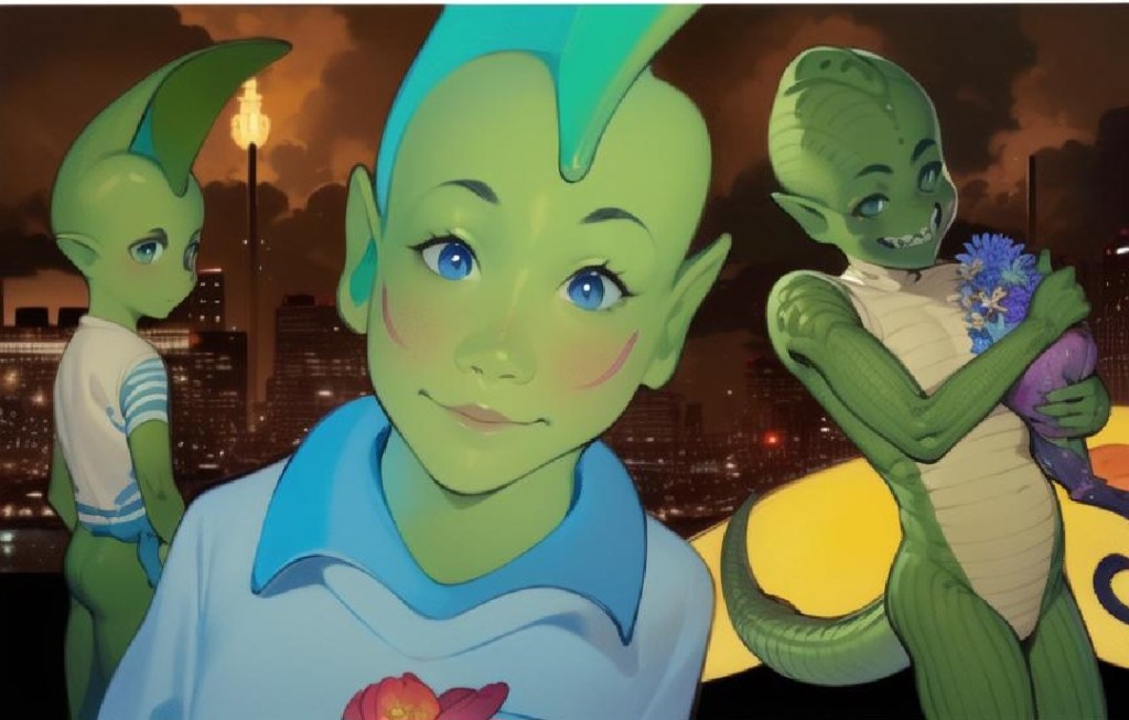 In the middle of the night, I got out of my sleeping bag to pee in the nearest bathroom, putting my robe on so as not to accidentally moon anybody. I went to the bathroom, and looked up at the window above the shower. There was a small, alien being staring at my berobed nakedness. I jumped out of my robe and ended up stark naked in the kitchen. I looked out the kitchen windows and saw the alien, or another one like it, walking across the yard under the yard light. It was green and as naked as I was.