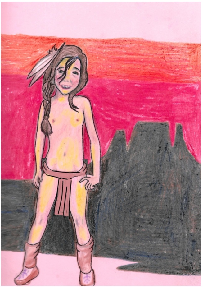 This is a redrawing of an old colored-pencil picture. The Native American boy is standing in front of a mesa-lined sunset.