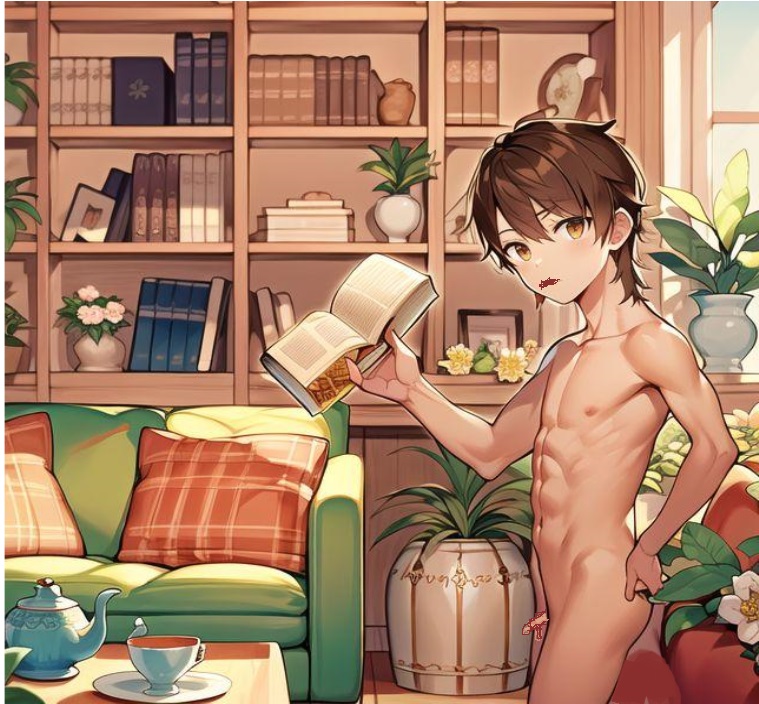 Albert loves reading in the nude. He does it whenever he can be alone in Dad’s home library. Here he is reading his personal copy of Watership Down. Of course, he has noticed that all the main characters in that book are naked. They don’t wear clothes at any time in any chapter. He has also noticed that they are almost all rabbits, one seagull, and some cats… all naked!
