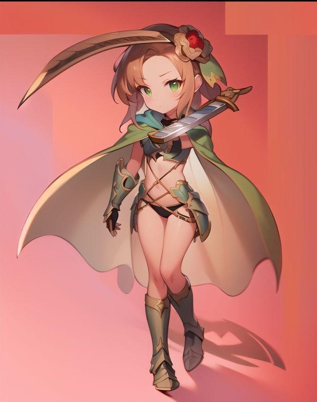 And here is the one where I get too carried away. I liked the cute face in this version, but the AI Mirror tool glitched like an AI program will and shifted the short sword to the wrong arm on the elbow. Instead of correcting it, I gave up at this point. Either of the first two are fine for my purposes.