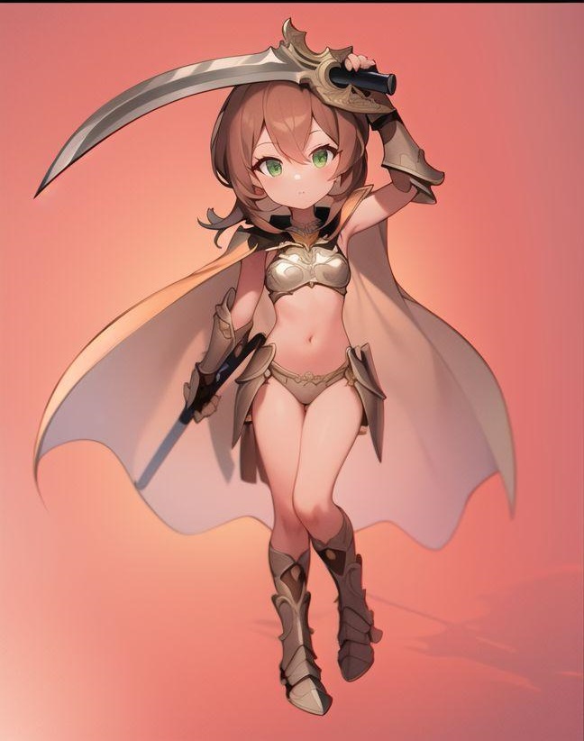 And here is the one where I get too carried away. I liked the cute face in this version, but the AI Mirror tool glitched like an AI program will and shifted the short sword to the wrong arm on the elbow. Instead of correcting it, I gave up at this point. Either of the first two are fine for my purposes.