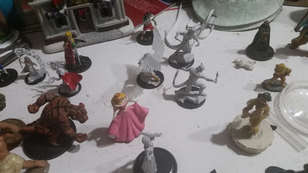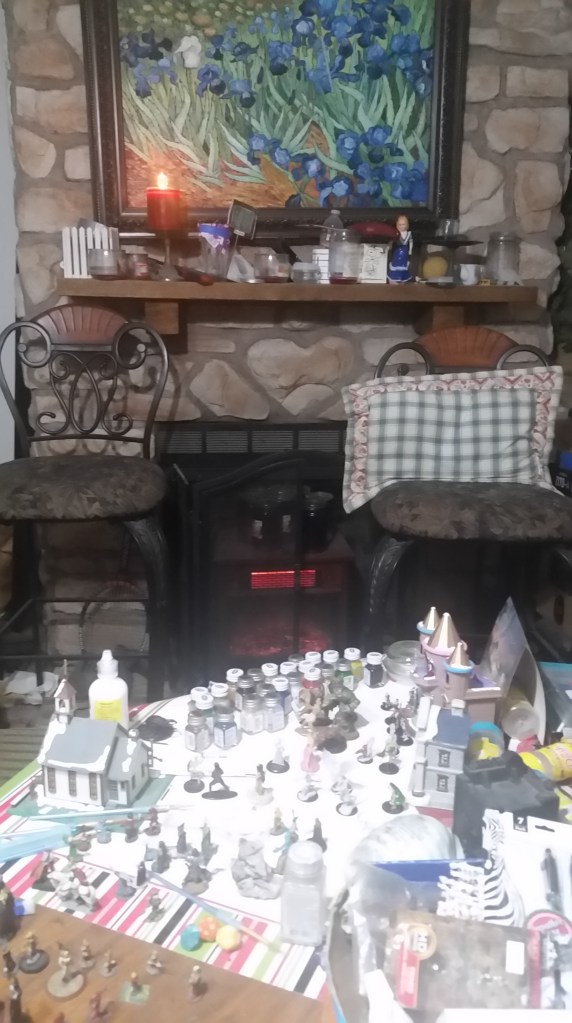 On days when I feel sick, like today, I can do things like work on paintable miniature figures for D&D or HO-scale model train layouts at the little table in front of the fake fireplace.
