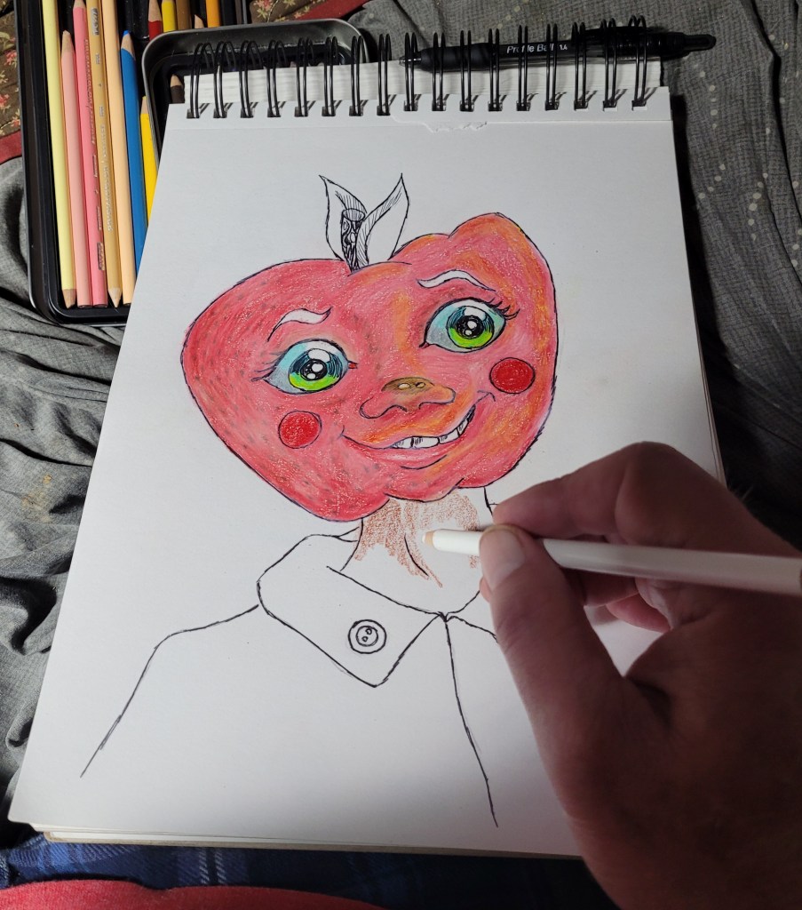 Here he is in his apple-headed glory after the last colored-pencil bit was added.