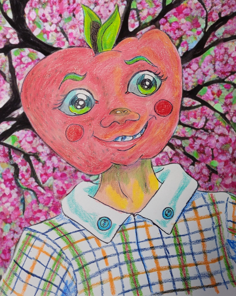 I started this goofy-cartoon art project with a sixteen-year-old cartoon character I drew in 2009. Applehead Andy was a stupid young boy who claimed he was only stupid because he had an apple for a head. He was initially a marionette made out of fruit by the puppet-maker Paghetto. When the Purple Fairy gave him life, he created in him a flaw where any time he needed to tell a lie, he stupidly told the truth. This resulted in Andy always having to say, “I know I am stupid, but it is because I have an apple for a head.” I drew it on white paper with pen and ink and colored pencils.