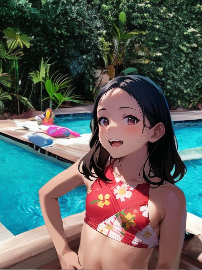 Gabby, daughter of the Amazon Superhero The Amazing Aztec, at her family pool, helped to take care of the pool with her parrot sidekick and the colorful fishing bird who eats the piranhas. Created the same way as the previous picture.