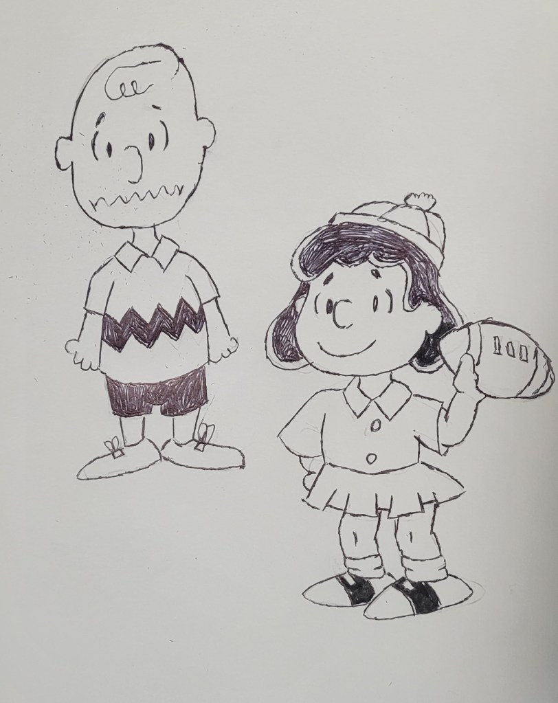 You can easily see that I am not trying to make counterfeit Charlie Browns and Lucy Van Pelts. My arthritis won’t allow that. Proof of that is in Charlie’s head wounds, unintentionally made in ink. But I did learn to draw in Schultz’s easily identifiable style. And so many things you learn by copying that you can’t even put them into words. Of course, it would be wrong to not mention that it is a copy of a copyrighted thing I don’t own. So, I can’t make money off of this picture. I would have to use what I learned only in my own original work.