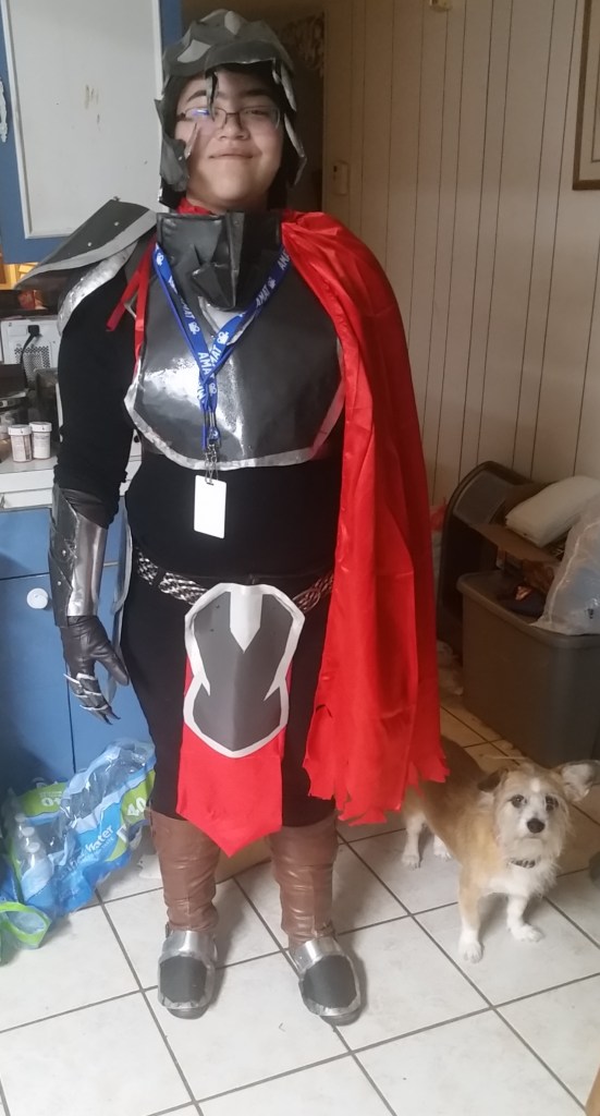 As you may have read yesterday, I had a miserable teaching day on Tuesday, and a better, but longer and more tiring day teaching on Wednesday. So, yesterday for me was a rest and recuperation day, as well as a feel-sorry-for-myself and licking-my-wounds day. For my daughter, however, it was a creative day in which she wore the suit of armor she made for herself to school on Halloween.