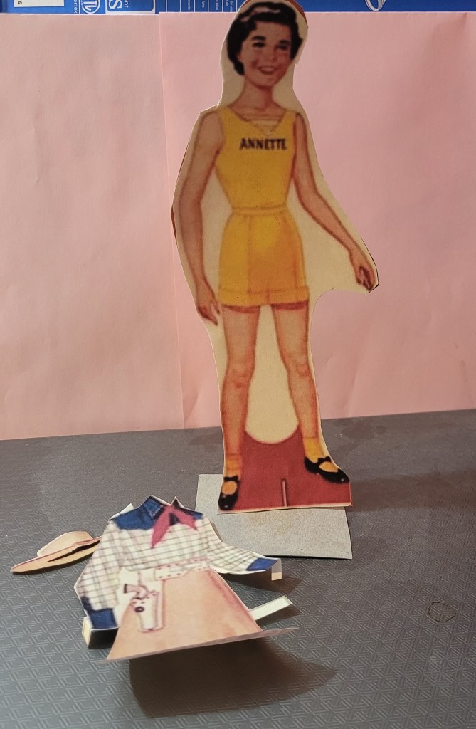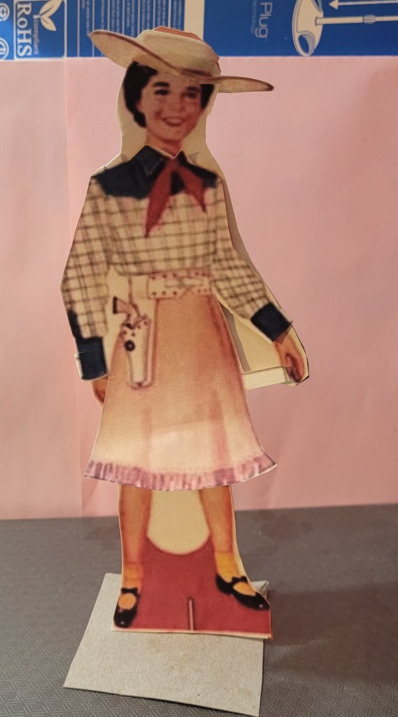 Annette Funicello from the cutout paper doll on the back of a 1960’s Cheerios box looks good in the cowboy getup… err… cowgirl getup you found under the corner of the bookcase. You have liked her since you were a boy. You once had a yearning to see a picture of her naked, but that never panned out. She was a Disney star and not allowed to even think bad thoughts, let alone pose for any nude photos. She was in the Mickey Mouse Club, not the Playboy Magazine Bunny Club. Darn it!