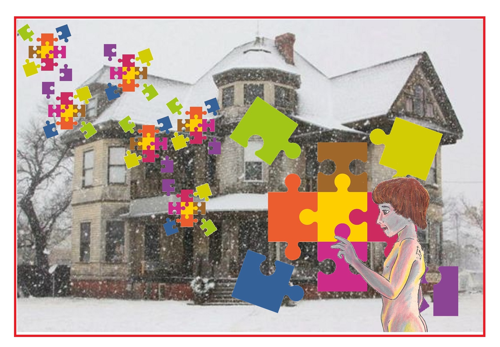 Now it’s Mickey’s turn to write about nothing, and try to live up to the nothing-masters’ artistic masterpieces of yore. For instance, the boy in the picture. I drew him from a nude model in a black-and-white photo. Nobody in class, not even the one who brought the picture, ever told me his name. And the class was forty-four years ago now. So, assuming the picture wasn’t old back then, the boy is now older than fifty-four, and possibly significantly older than that now. So it is a picture of a nude nobody in front of an abandoned house in the snow however-many years ago in a place that is probably nowhere now. And I won’t even mention the imaginary puzzle pieces floating through the air for nobody to put together. What’s that? I just mentioned them? What did I mention? They are really just nothing.