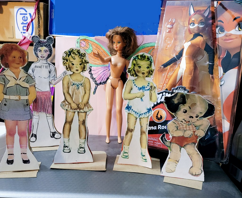 Ricky (a 1960’s boy toy for Skipper) sits with Ashley Olsen between more recycled Goodwill Barbies. 1980’s Skipper is trying to push poor roller-skate Barbie off the shelf.