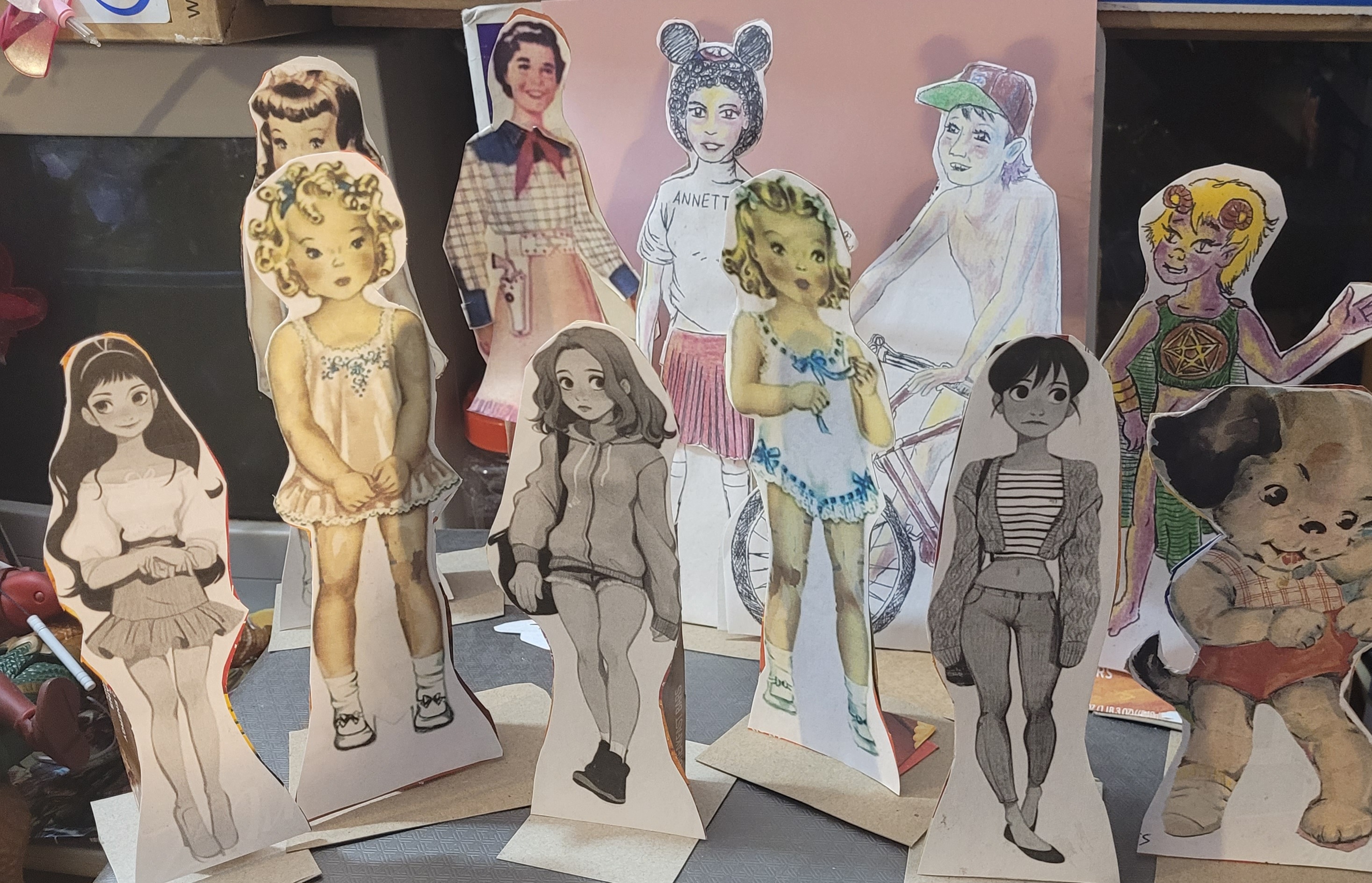 The kids are protected by Eustace the purple pottery dragon who was fired in my mother’s kiln during the height of her doll-making hobby and painted by me. The kids here include a tiny Tommy doll, three Skippers from the early 70’s, and Hermione from Harry Potter and the Sorcerer’s Stone. You can see the Scarecrow and the Tin Man in the back, and there’s also Goodwill Barbie that for some odd reason has purple hair.