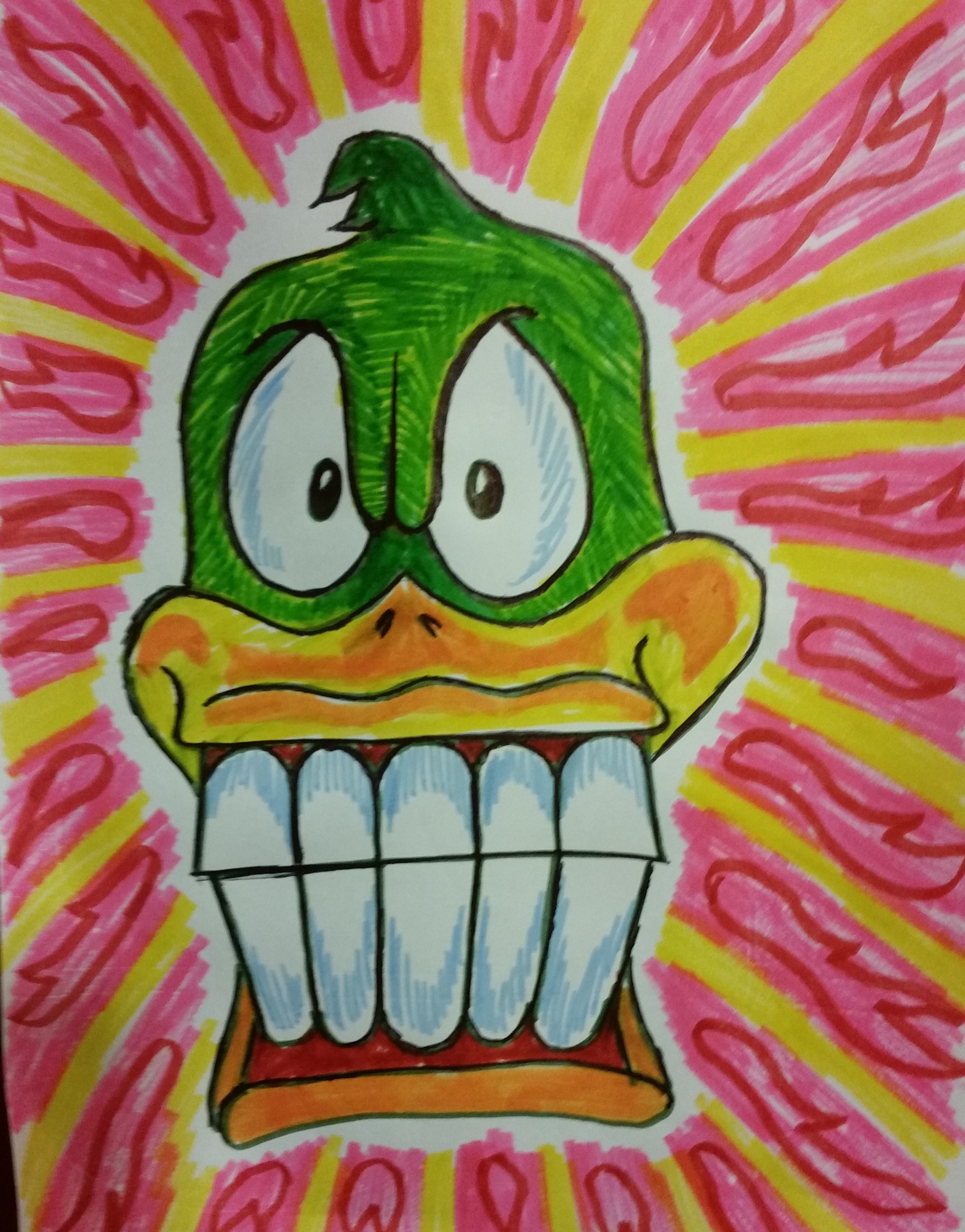 This dream is a mental-disturber caused again by fever. Here the two gigantic toys play with the little girl. I was not actually in this dream. I was an observer floating above. I think the bear was inspired by a Care-Bear.