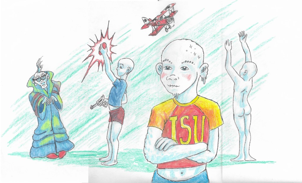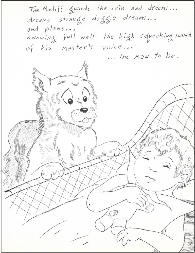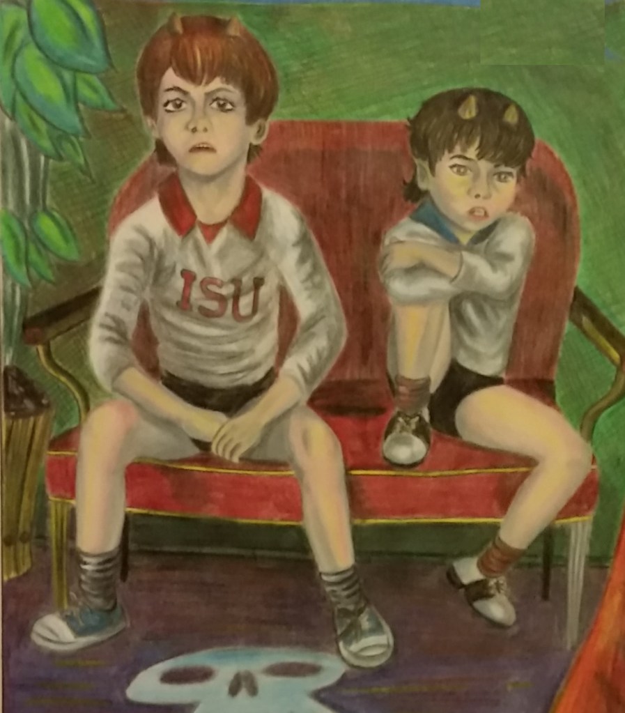 This is from a dream I had in college at Iowa City. I made an entire cartoon out of it called Babysitters Hate My House, It is about a babysitter having a horrible time with my two sons as she loses control when they show her the man in the basement that, “Daddy built out of a kit.”