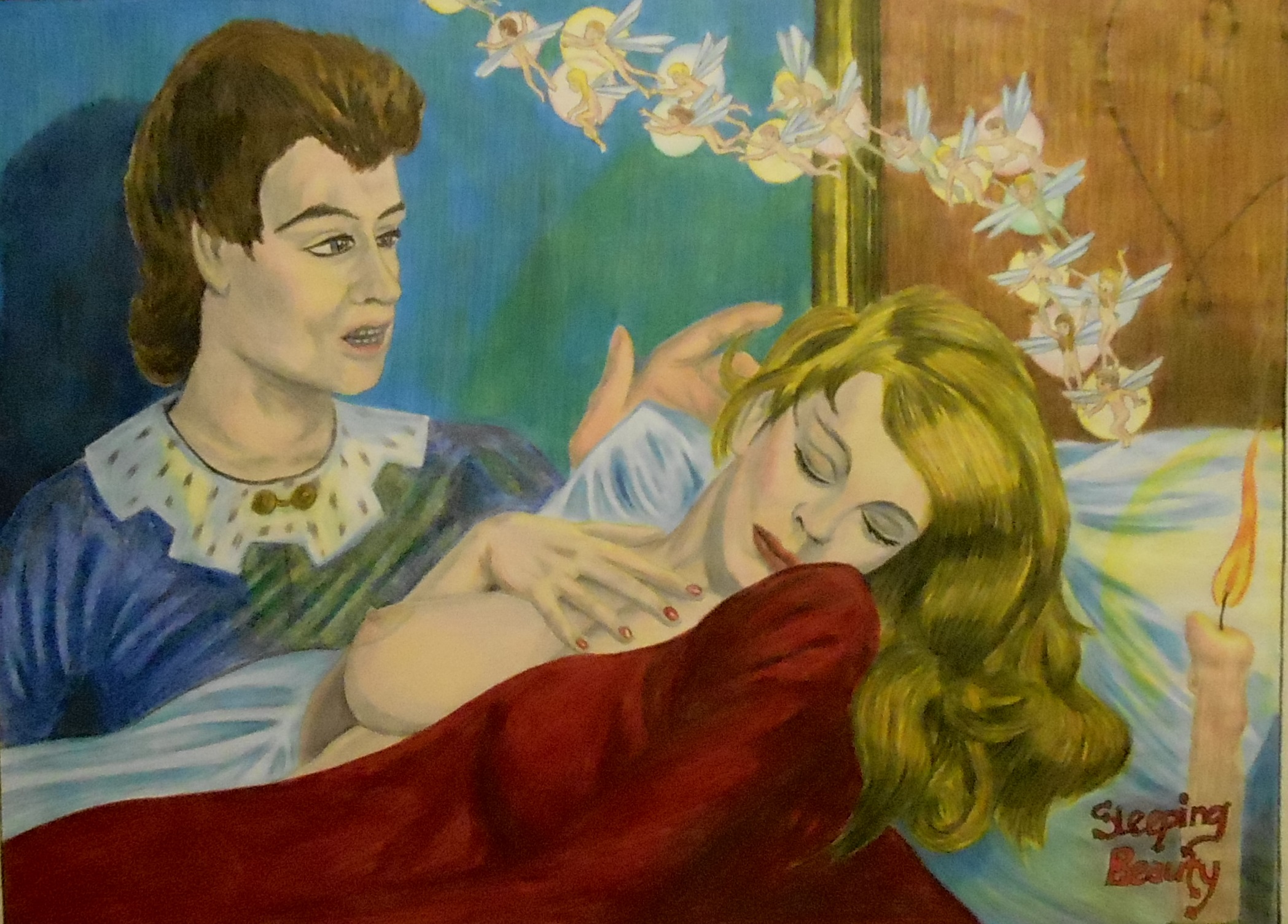 This picture has all the elements of the actual dream, the candle, the line of glowing pixies, the sleeping princess, and Prince Charming. But nothing here looks like it did in the dream. The prince and the princess were both young teens that I did not know in real life. The fairies were larger and a lot more obviously nude.