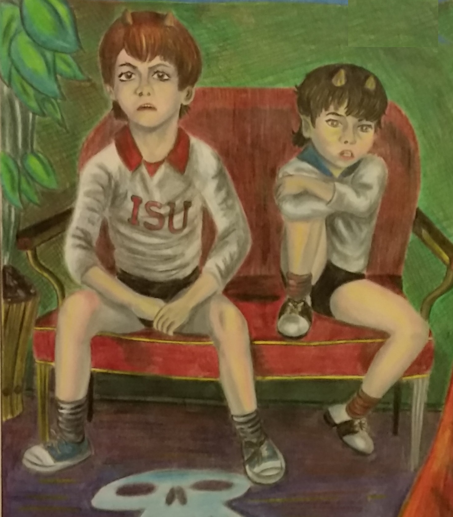 I have always had very vivid dreams. This picture was inspired by one. I dreamed of being a seventh-grader going to school in lizard-person school on a dinosaur planet. And throughout the dream my classmates were threatening to eat me. Oh, and the clothes they are wearing in the picture were the school uniforms.