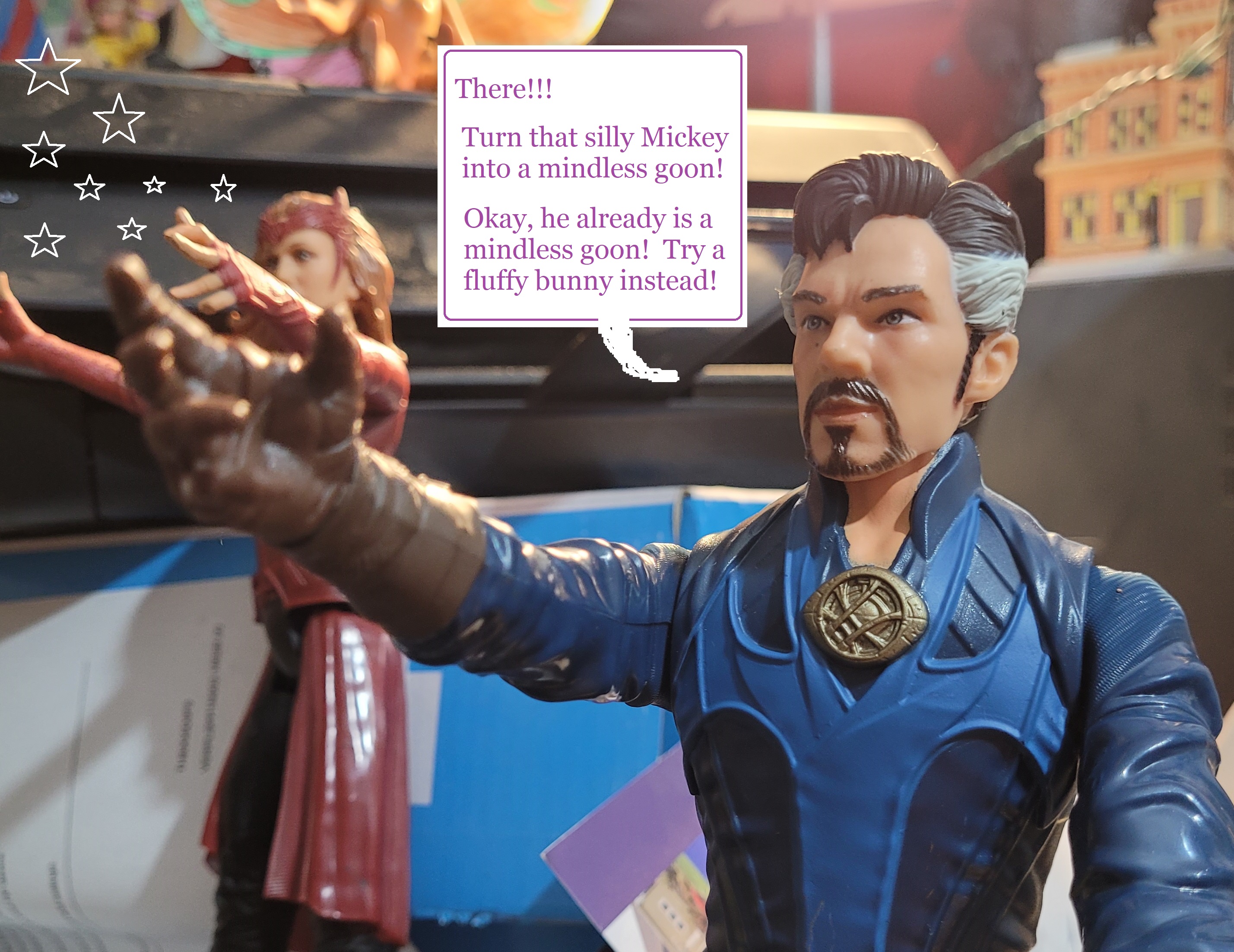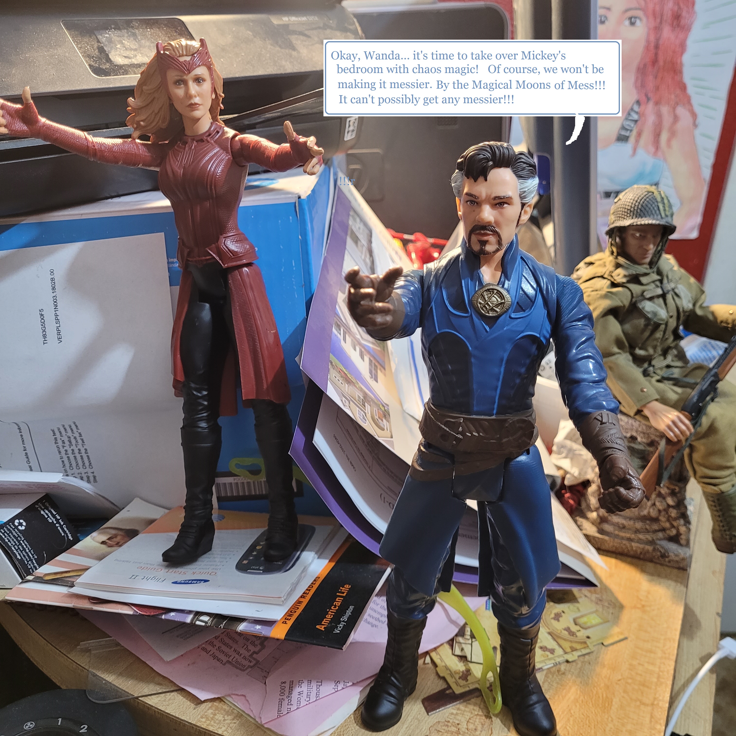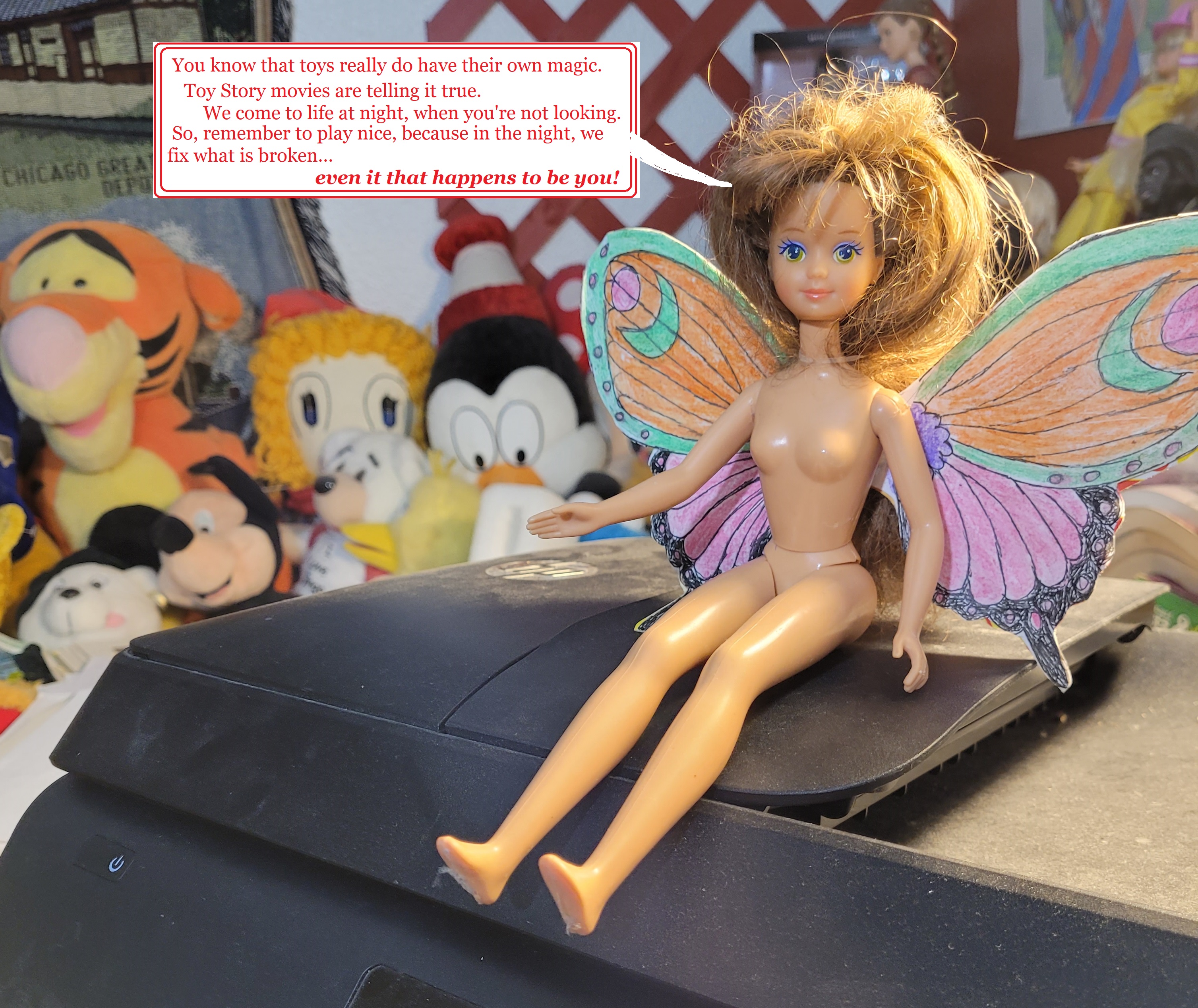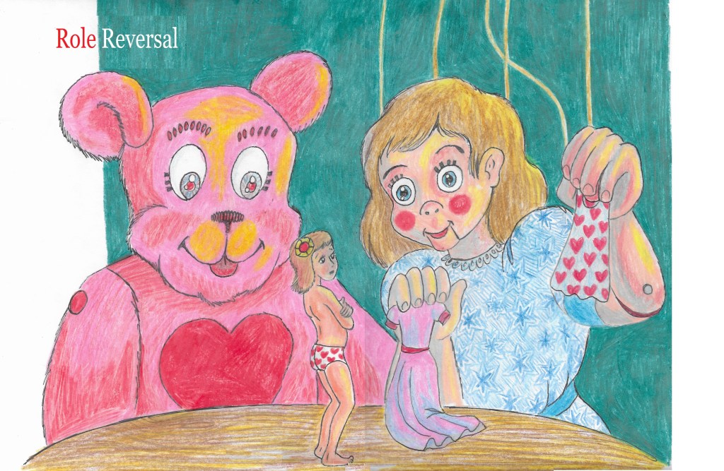 This dream is a mental-disturber caused again by fever. Here the two gigantic toys play with the little girl. I was not actually in this dream. I was an observer floating above. I think the bear was inspired by a Care-Bear.