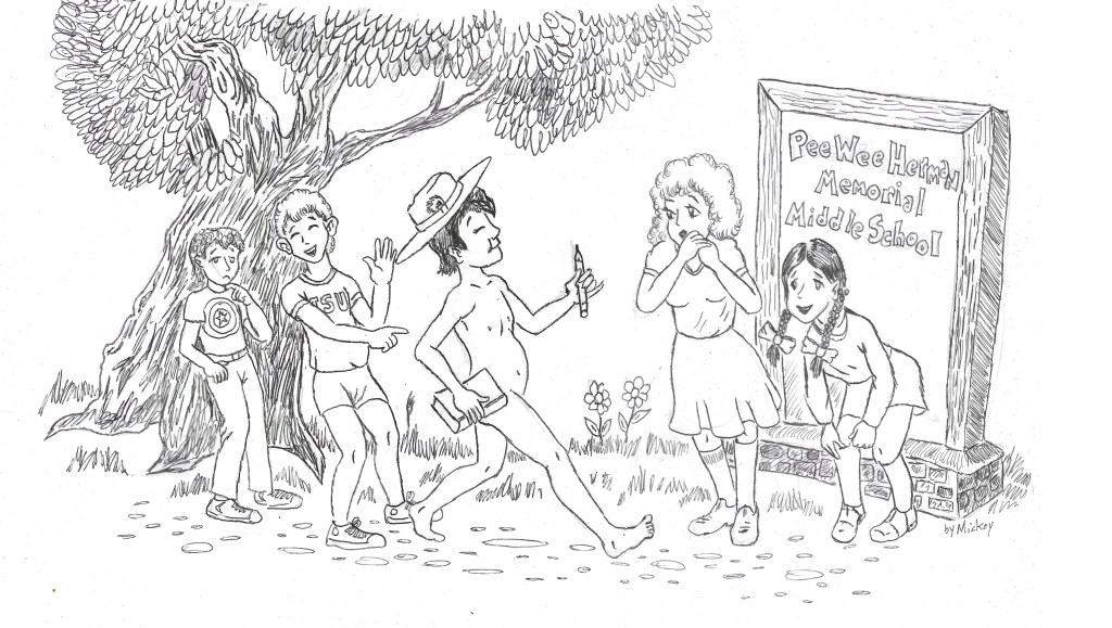The next morning, as students who walked to school from the neighborhood gathered in front of the school, Rudy showed up striding purposefully towards the front door wearing only a hat.