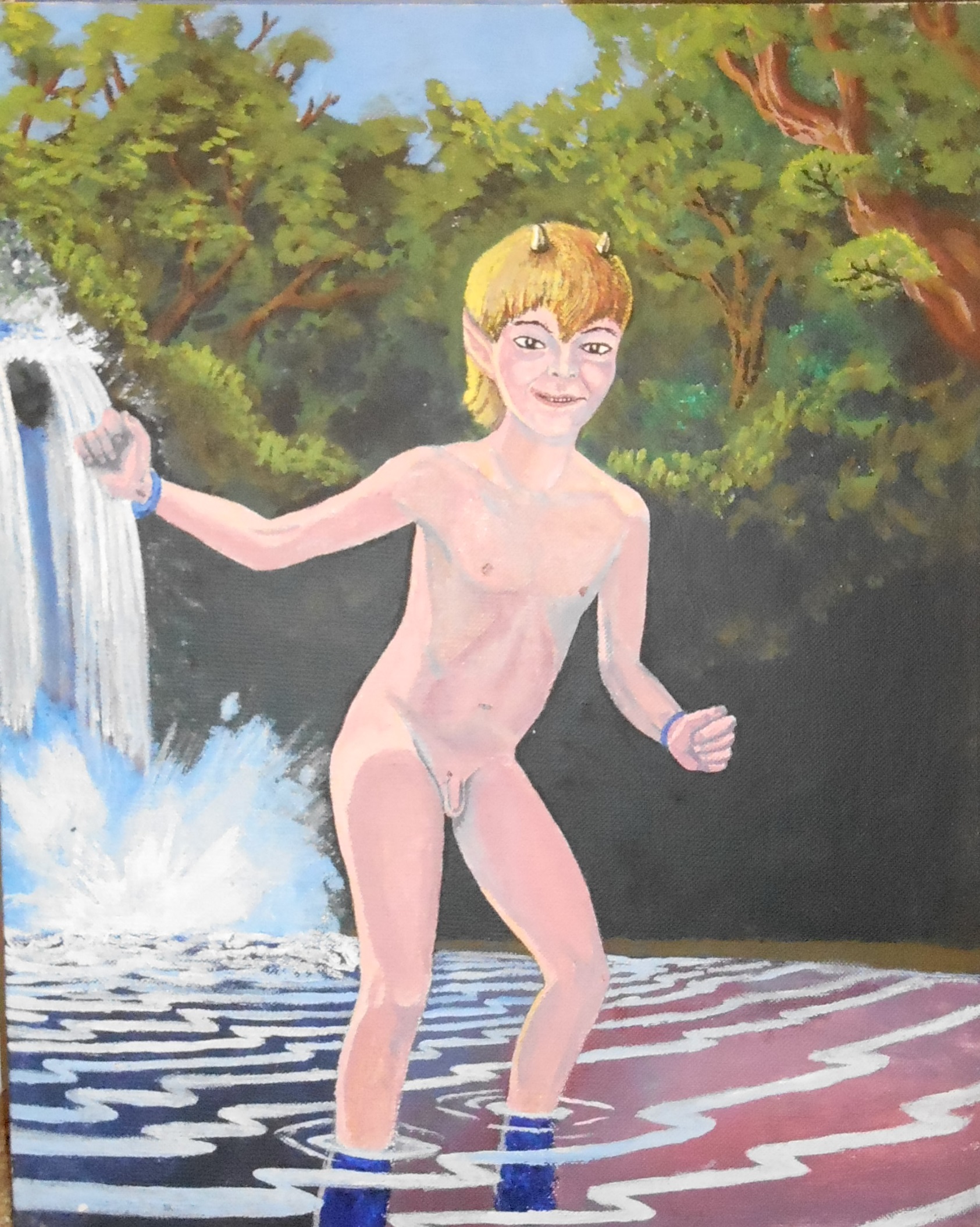 “The model for this wasn’t me. And he was wearing a wet swimsuit. It only became about me when I added the faun’s horns and made him naked. It was painted after I was exposed to naturists at the clothing-optional apartment building in Austin, Texas by my then-girlfriend and her sister who lived there with her husband and baby. It was a painting that expressed the joy I saw in people who were unafraid to be naked in the presence of others.”