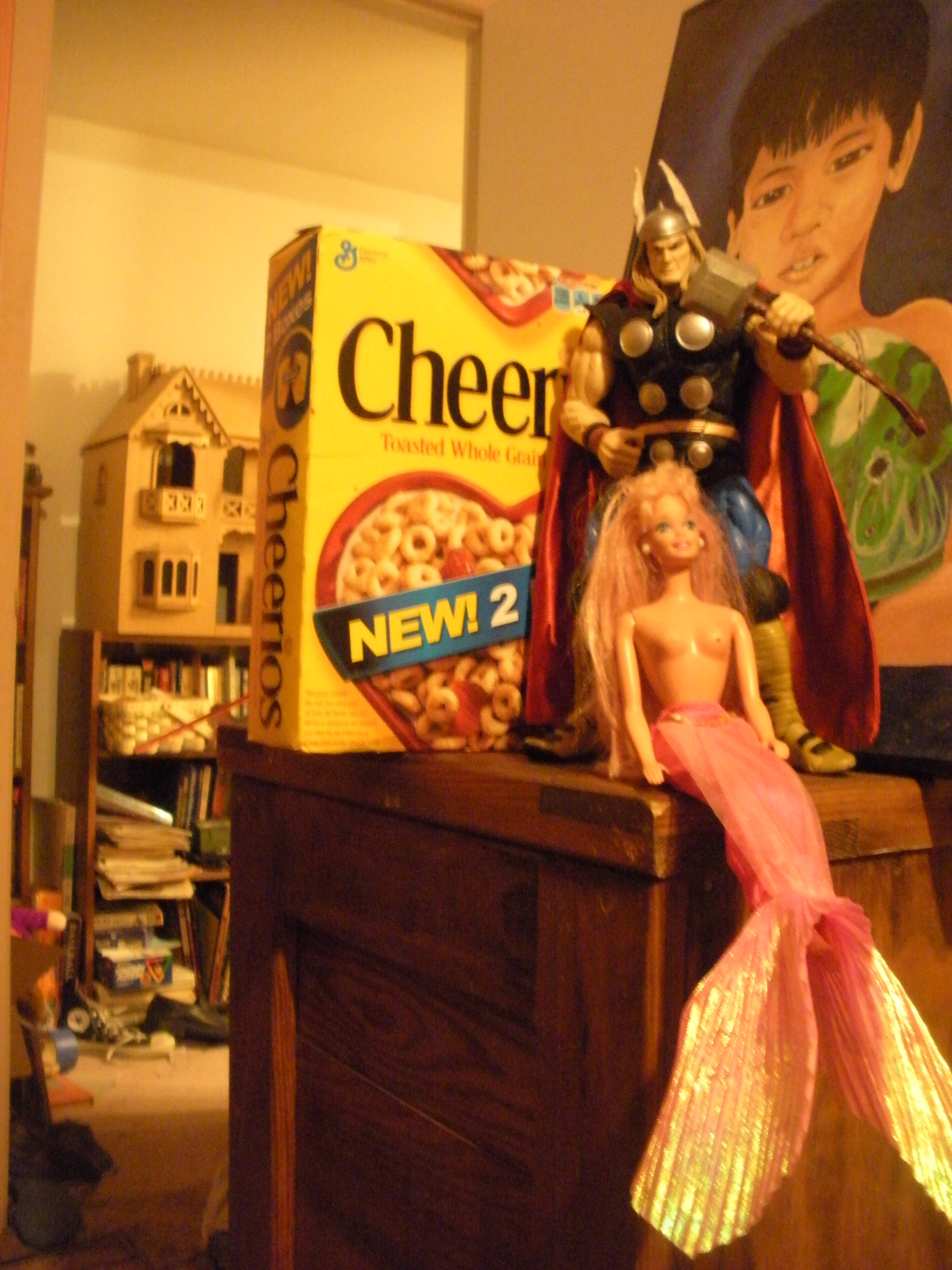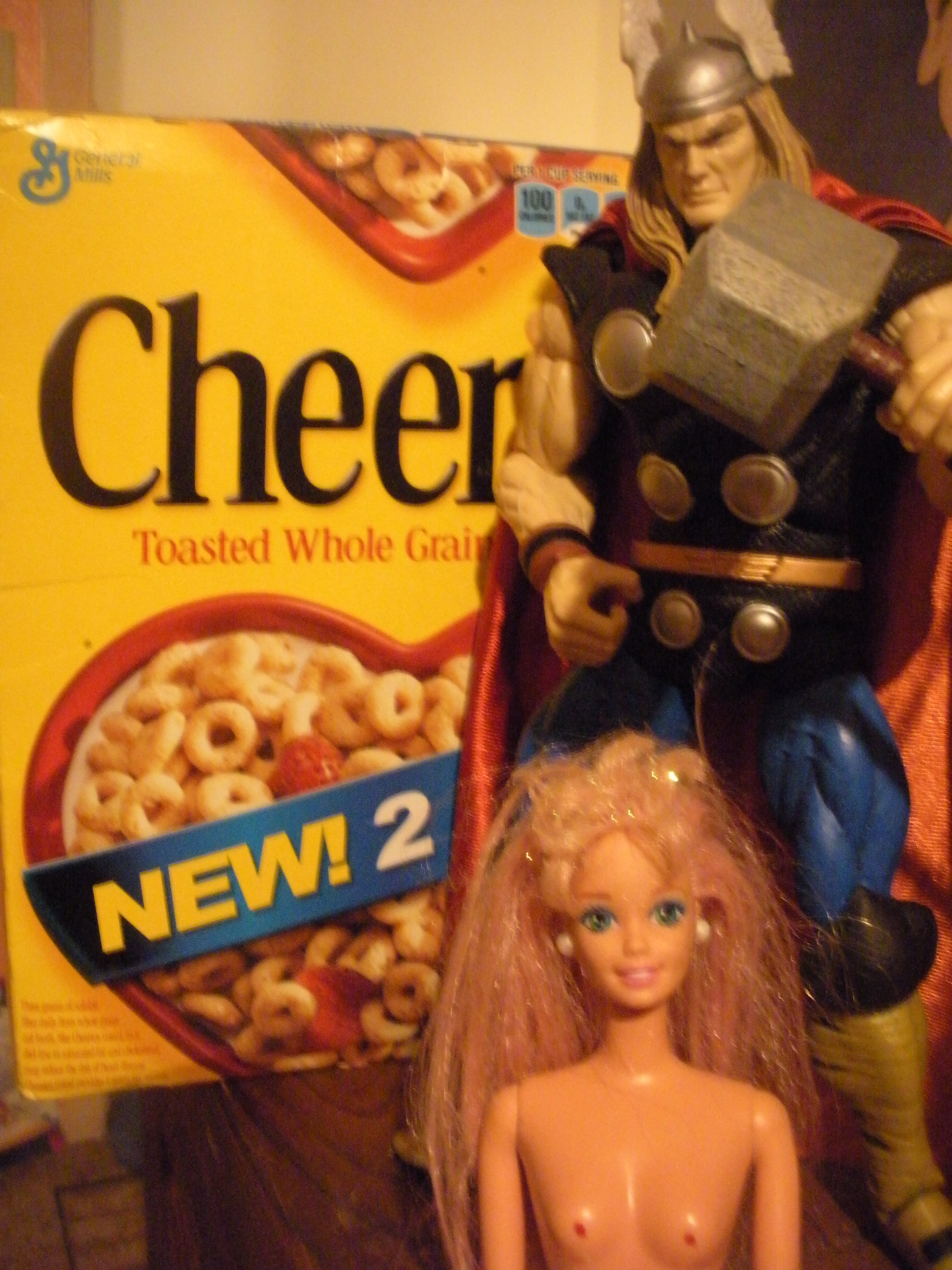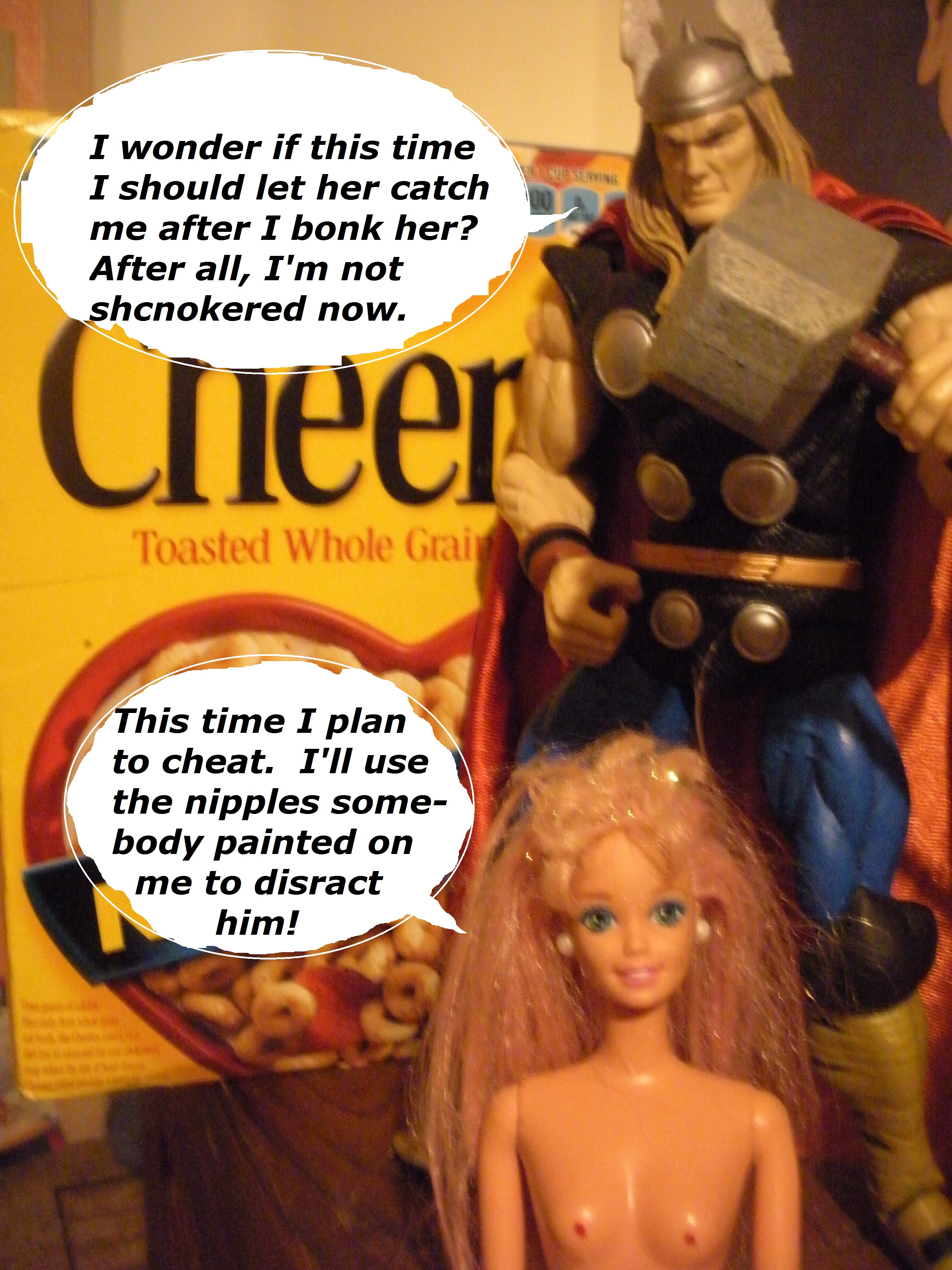 I was trying to think what I would post today, and coming up blank. I have a pathological need to keep posting here, especially since my brain is currently switched to editing mode for my novel The Magical Miss Morgan. One can’t keep a sacred oath to write every day if there is no writing going on other than editing (which doesn’t count because no new creative thoughts are being generated and the fertile spore-producing areas of my mental storage shed may grow sterile for want of fresh garbage being piled there). So I went looking through my file of photo Paffoonies to find something I haven’t already inflicted on potential readers to the point of making them gag and doing something sensible like shutting off their computer for a while. Unfortunately all I found was this potential gag-inducing library photo of the time the Mighty Thor got drunk on overripe Cheerios and milk and decided to commit cave-man love on beautiful topless mermaid Barbie. (I know… topless and in the possession of a fifty-eight-year-old man… kinda creepy… but honest, I am intending to make a shell bra with real sea shells and just haven’t gotten around to it yet, though I have the shells selected and the material cut. My sewing machine is broken. Yeah, that’s my story… and I’m sticking to it). (Goodness! That last parenthetic expression is the fifteenth longest one I have ever written!)