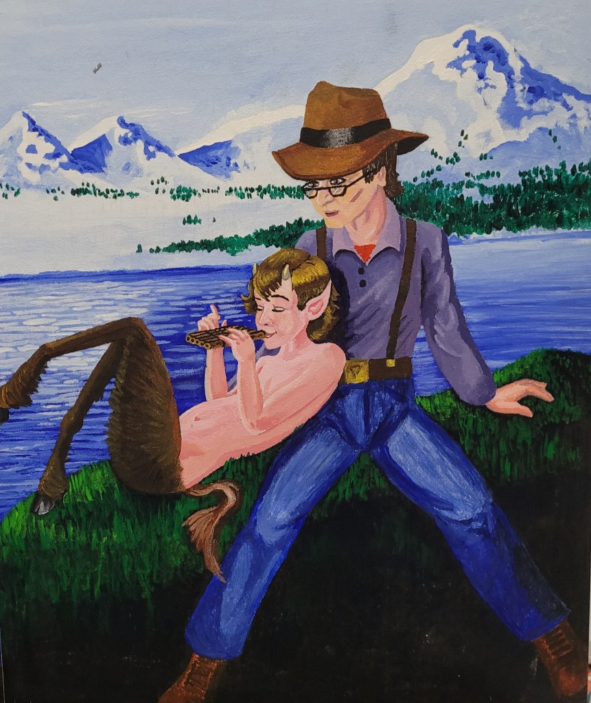These two are among the earliest paintings I did. They were both done on canvases that I stretched over the frame myself in high school art class. The purple one is a scene from Shakespeare’s Midsummer Night’s Dream. The blue one doesn’t have a title, but you can see what it is. It is an ancient shibboleth water monster lurking under a dock, fishing for young boys to eat.