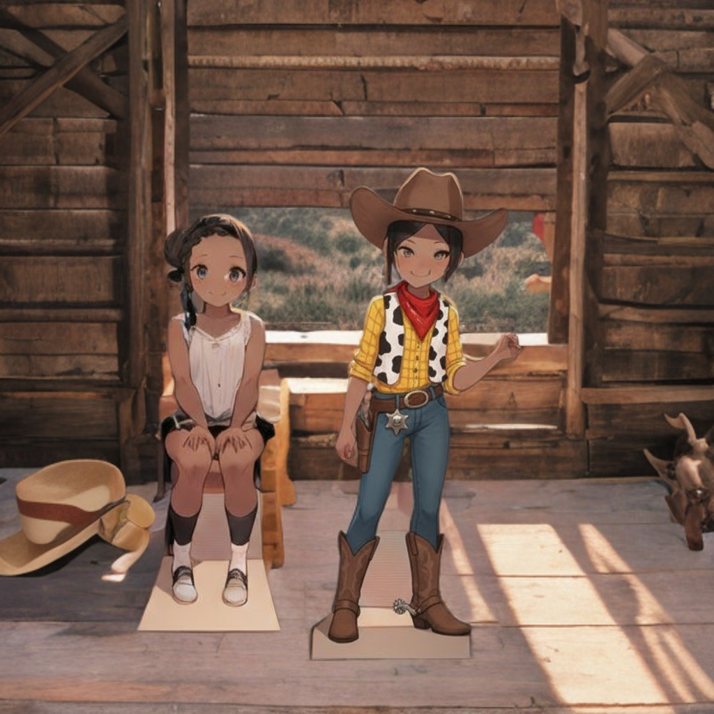 I first took a photo of the two paper dolls and removed the background. The cowgirl Woody was originally a drawing of Annette Funicello done by me, then turned into a paper doll. I turned the Mickey Mouse Ears into a cowboy hat and dressed the figure as Woody from Toy Story. The little blonde girl paper doll became the brunette girl seated on the table. The background of the inside of a barn was generated around the characters with Picsart AI Photo Editor.