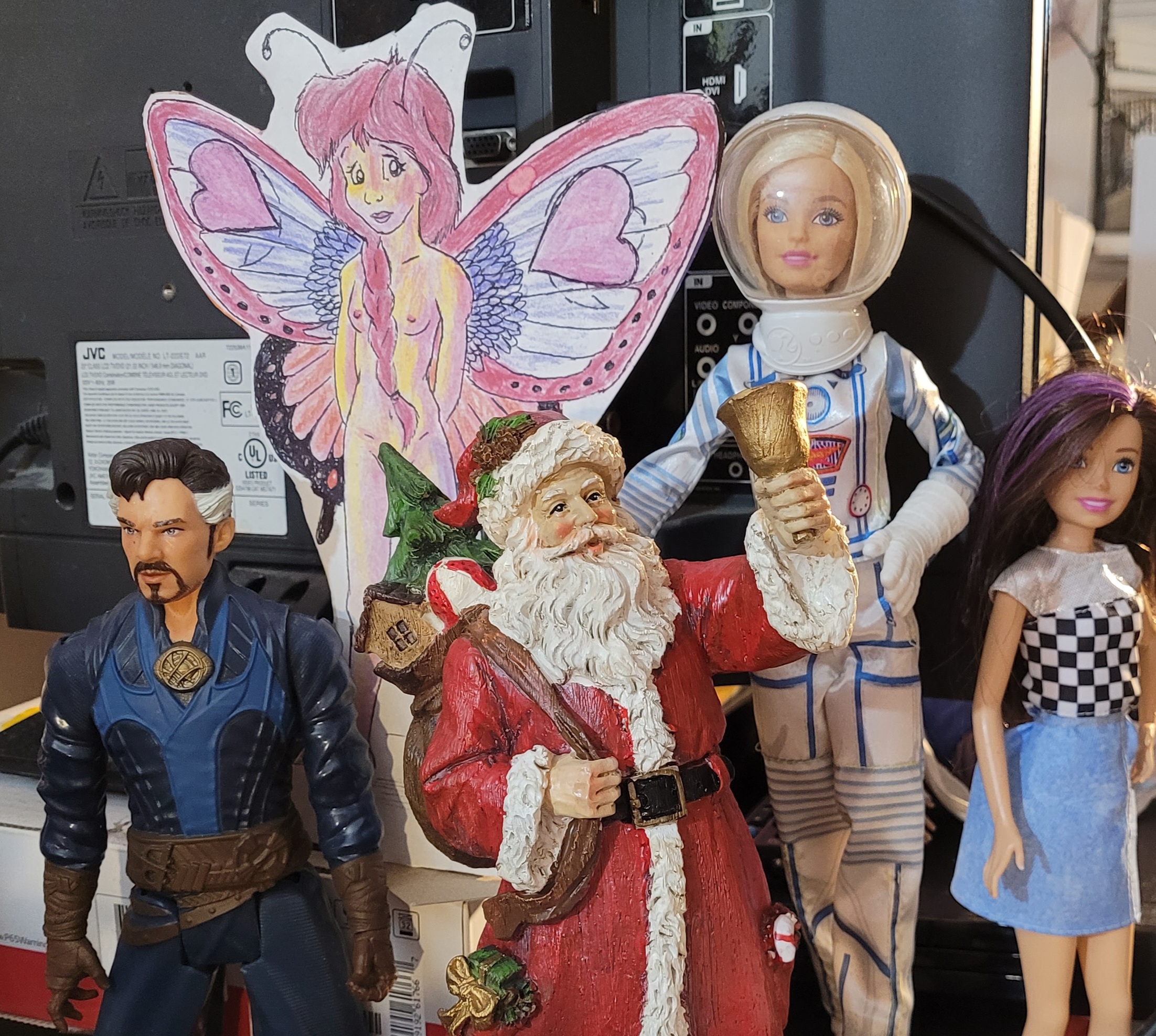 In point of fact, my whole life of late is pretend. I have been trying to negotiate with a small publishing company for two months to try to get my best books promoted at a book fair in New Orleans even though I couldn’t possibly be there in person due to health and wealth concerns. And, like all schemes from publishers nowadays, it is a little bit scammy with the amount of money they want me to pay for including my books and saying nice things about them to people who probably won’t want to buy them anyway. I am probably only a pretend author. And I spend my time mostly in my sick bed, talking to plastic dolls as if they were real children, even during a part of my Christmas holiday.