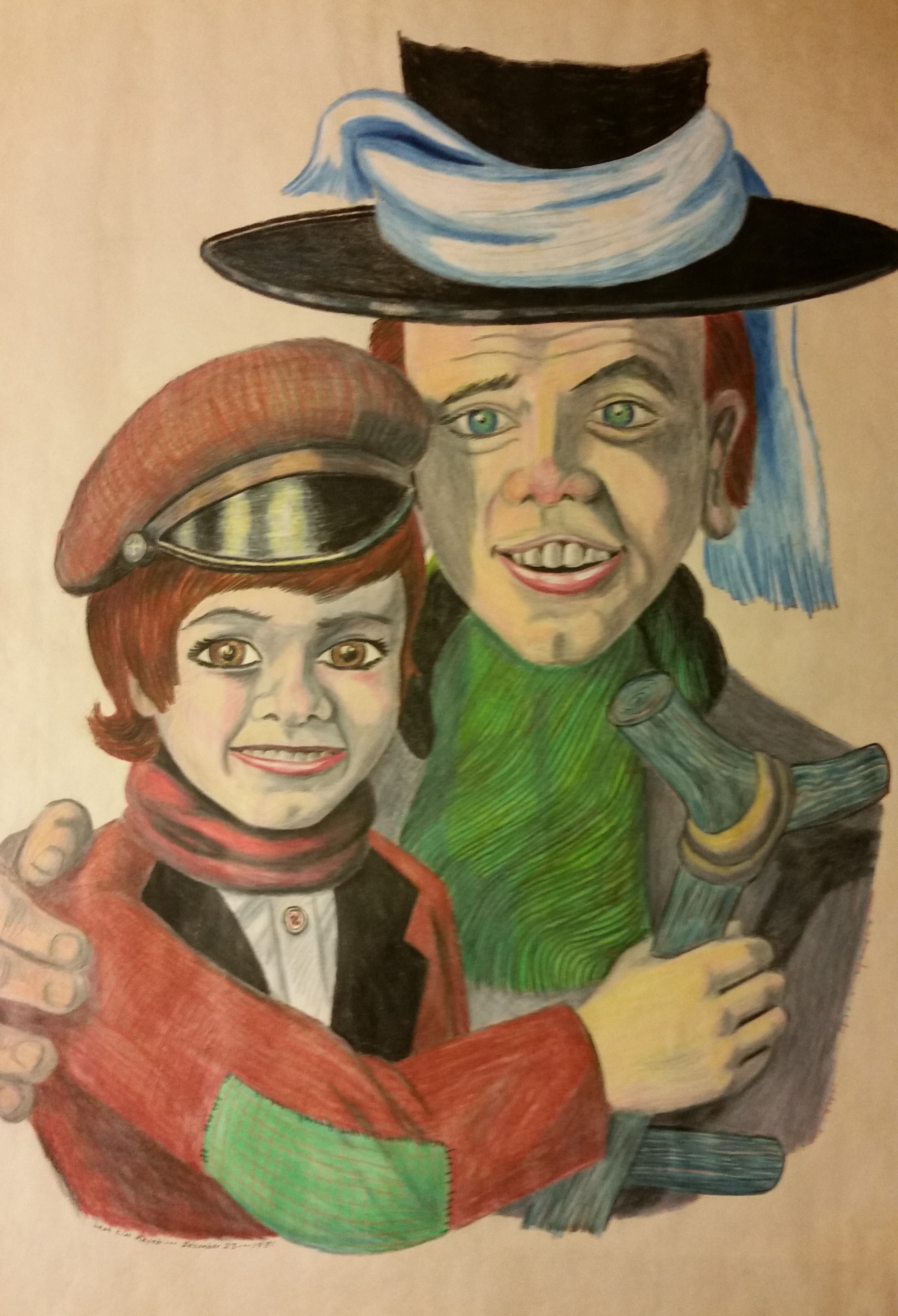 The kids are protected by Eustace the purple pottery dragon who was fired in my mother’s kiln during the height of her doll-making hobby and painted by me. The kids here include a tiny Tommy doll, three Skippers from the early 70’s, and Hermione from Harry Potter and the Sorcerer’s Stone. You can see the Scarecrow and the Tin Man in the back, and there’s also Goodwill Barbie that for some odd reason has purple hair.