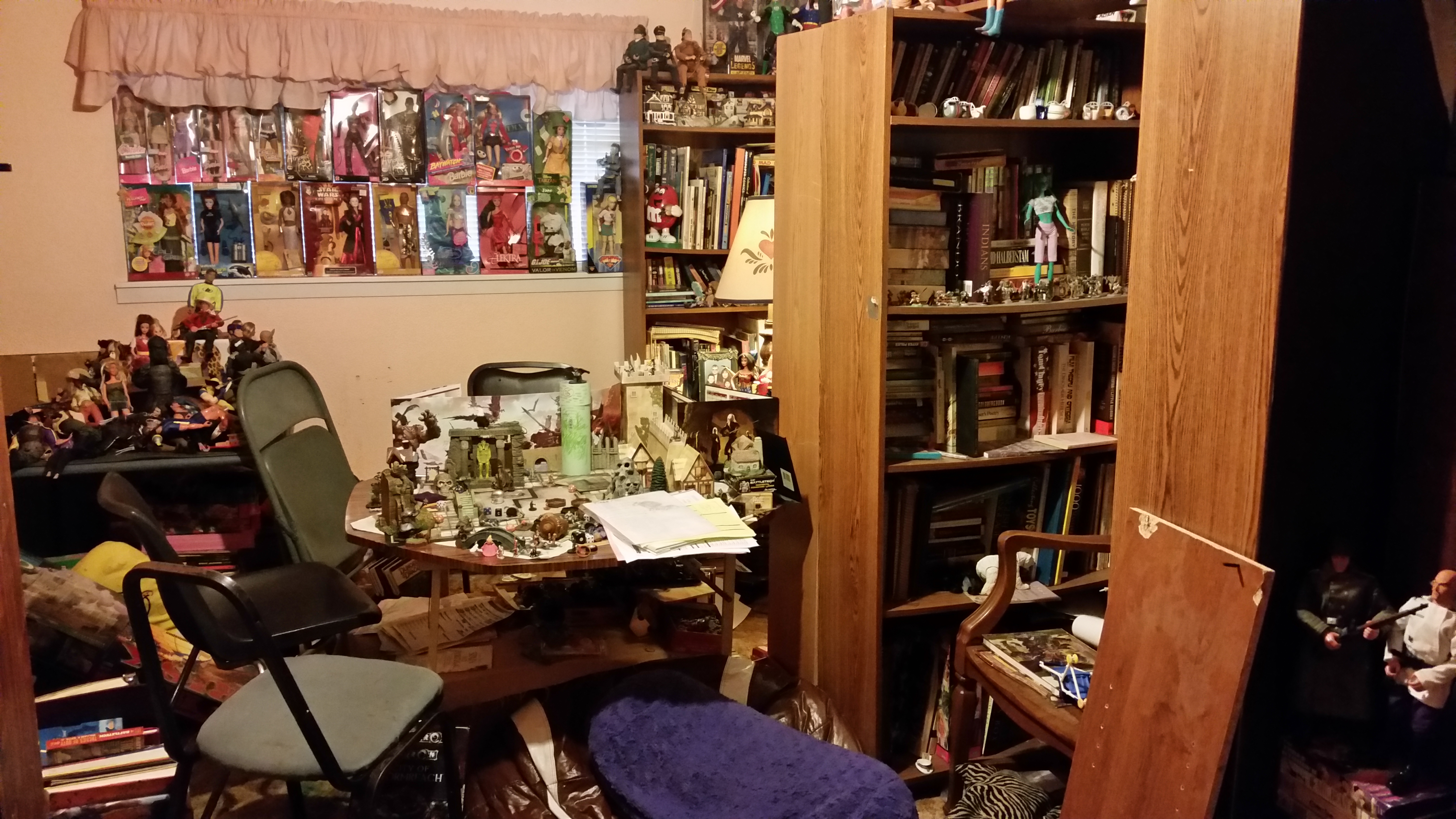 This is my library, the place where I keep my books.  It is also a place for my doll collection and the Dungeons and Dragons game that I’ve been playing with my kids for more than a decade.  It is a place to read and think and… oh, yeah, there’s an X-Box also.  Well, that’s one way to get the kids to spend time there too.