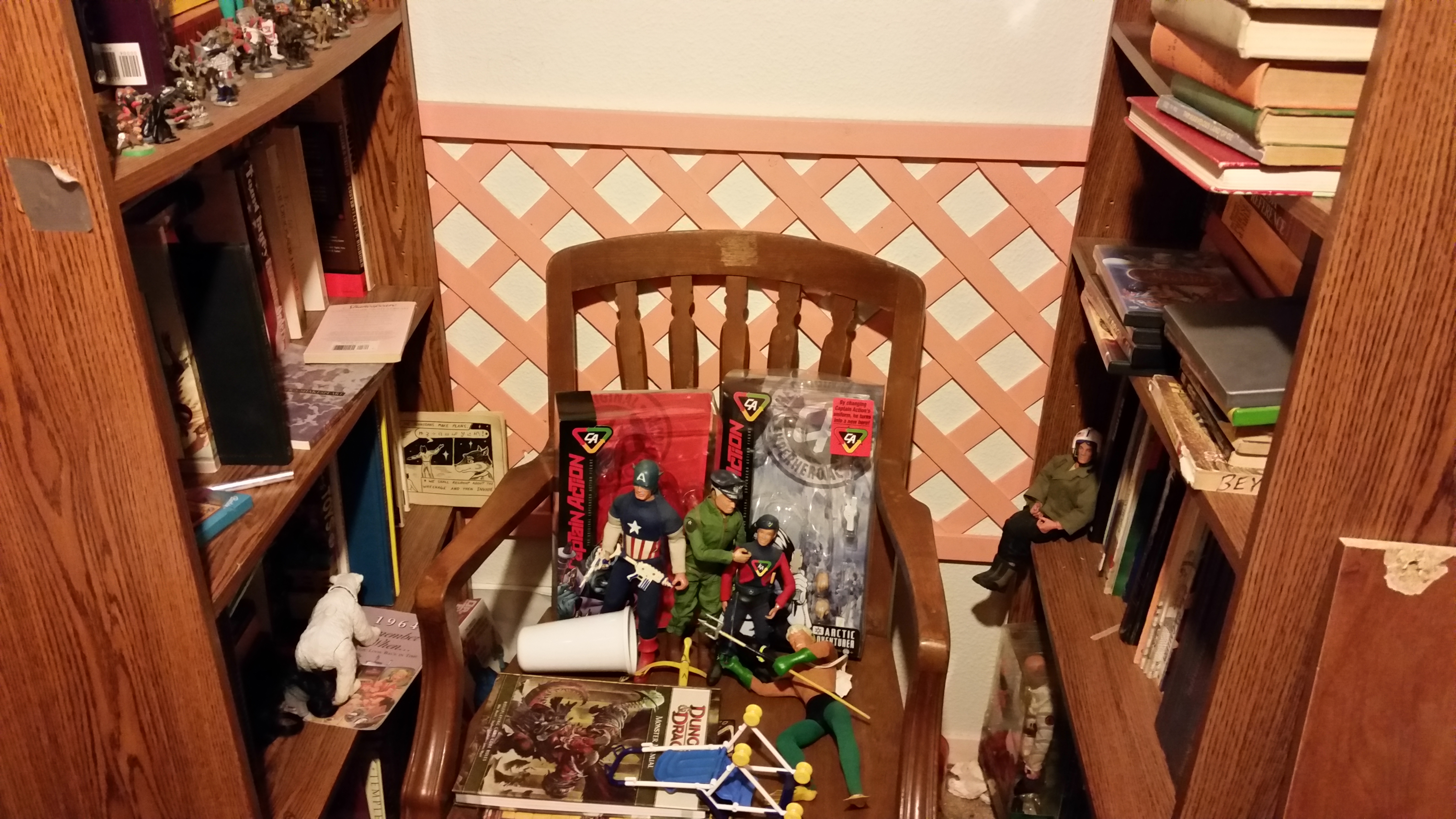 This reading nook is currently being used to display parts of my Captain Action collection.  The Captain America costume on the left is my original property from Christmas 1967.  The Steve Canyon costume next to it is an E-bay purchase and a rare find from a decade ago.  Aquaman is a combination.  The mask, trident,conch horn, and swim fins are from my original set from Christmas 1966.  The suit itself had to be replaced from E-Bay because I played with it until it was no more than a mass of frayed thread.  The gloves come from a innovative toy company called Classic Plastick run by Wes McCue.  http://classicplastick.proboards.com/  You may notice cups and junk left by kids in my library.  Cheetos wrappers from food that my daughter the Princess loves are often found crammed in between the books.