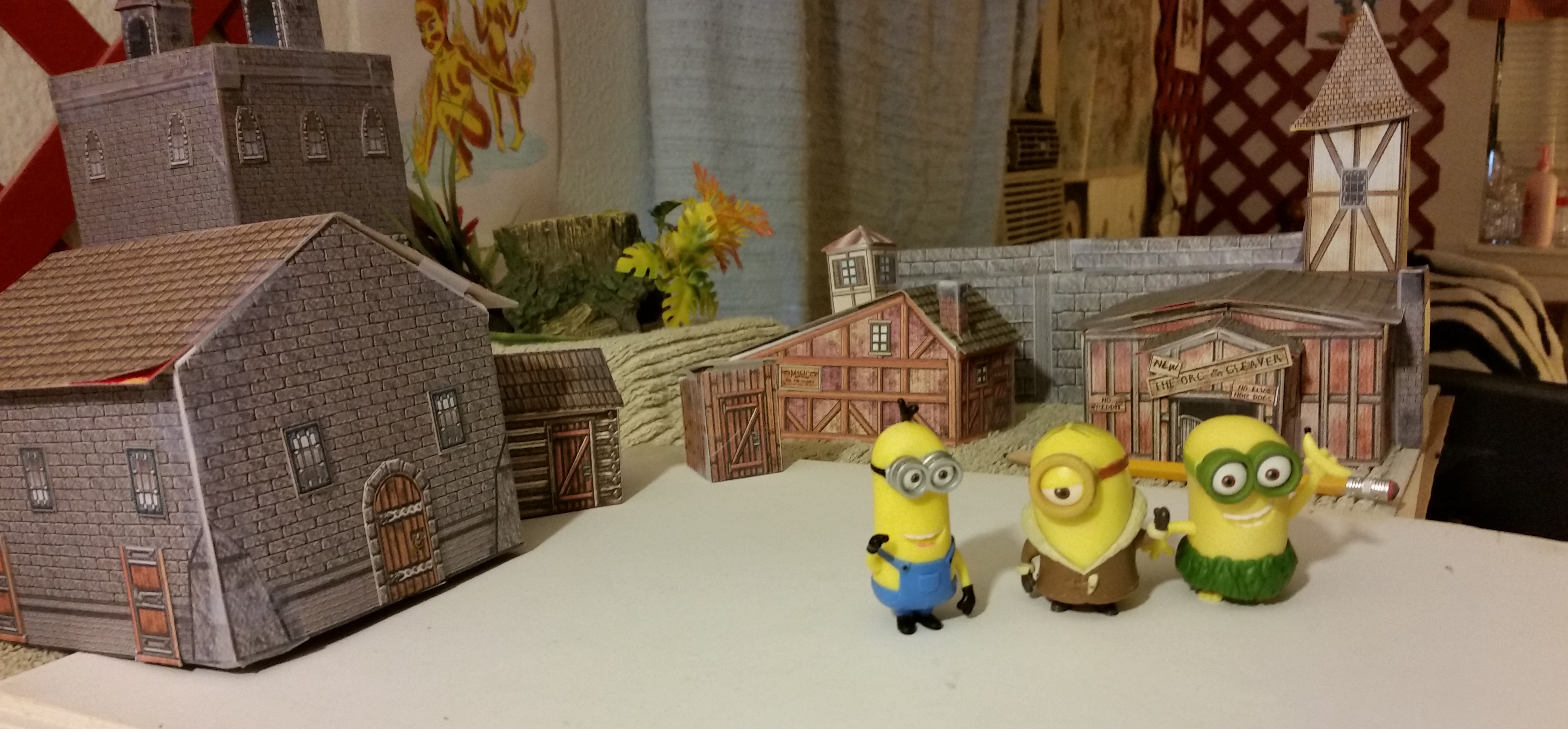 Having already written well over a thousand words today on a different writing project, I don’t really have to worry about length on this one.  But it is intended to be a scrapbook piece anyway.  Thing #1 is the completion of a mini-collection.  I now have all three of the main Minions from the new Minions movie.  From left to right are Kevin, Stuart, and Bob posing for their picture with their fully pose-able arms in the middle of Cardboard Castle.  There are still many many many Minions left to collect, but the first three are the most important bit… I think.