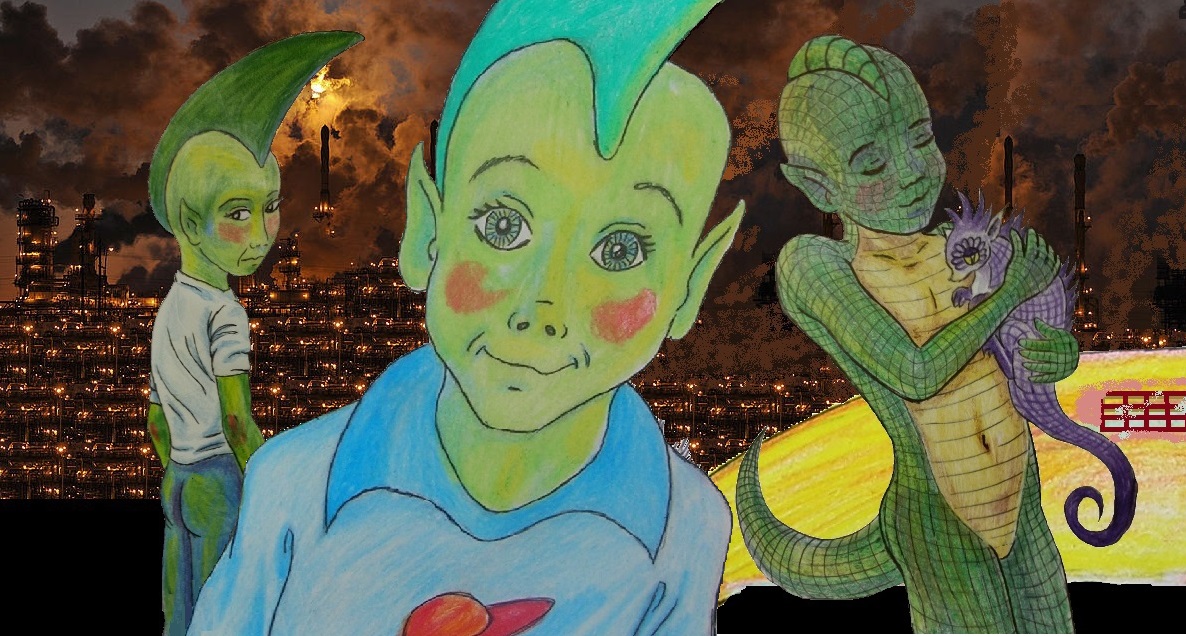 I have now reached the climax of the plot in my Sci-fi novel Stardusters and Space Lizards.  I am at that moment in the story when characters, even the most important main characters, may die.  I know, in fact, because of the ending that already exists that some of the main characters will die.  I am not entirely certain that I know which ones yet.  The three I have portrayed here are (left to right again because I am an English speaker/reader and horribly addicted to the same-old same-old) George Jetson, Davalon, and Sizzahl the Lizard Girl.  At least one of them has to die for the plot to work out.  But which one?  I am deeply in love with all three.