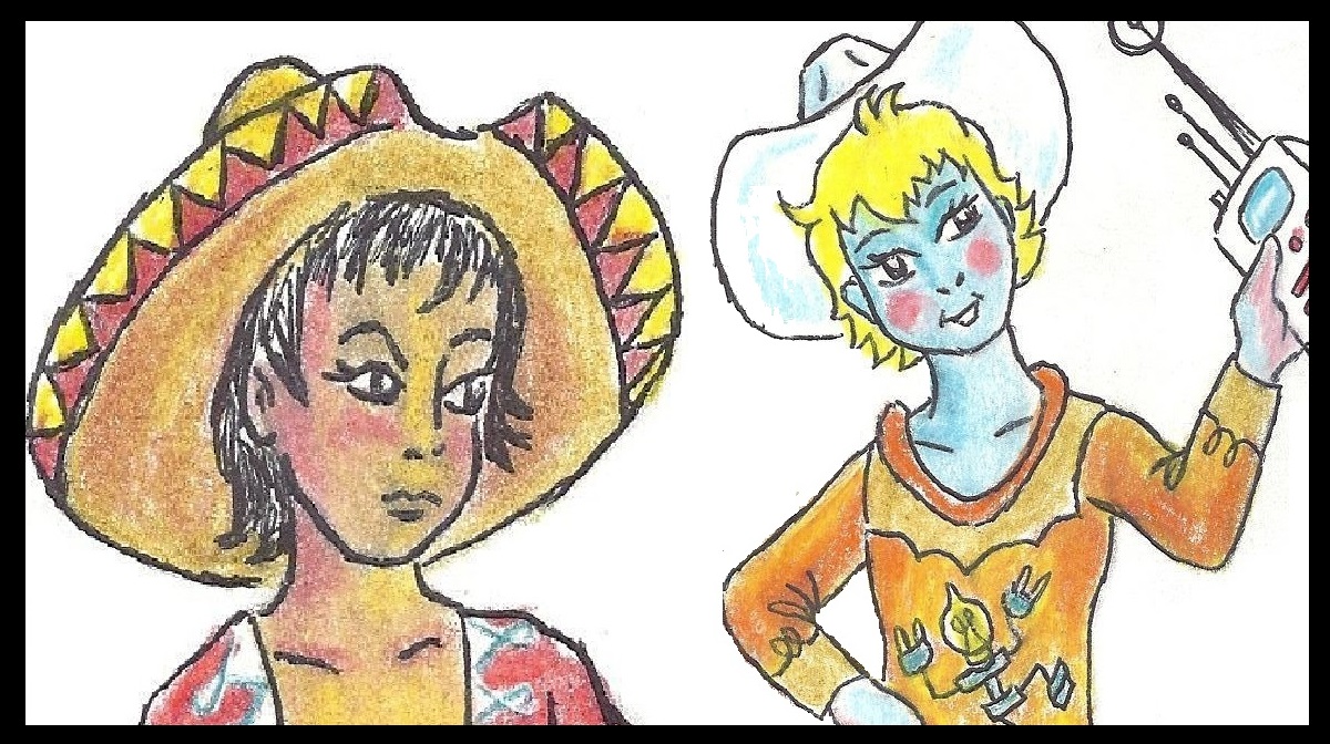 Gyro Sinjarac, the blue-skinned Nebulon, and his best friend Billy Iowa both wore their cowboy hats, boots, and space-cowboy clothes sitting in the middle of the floor.
