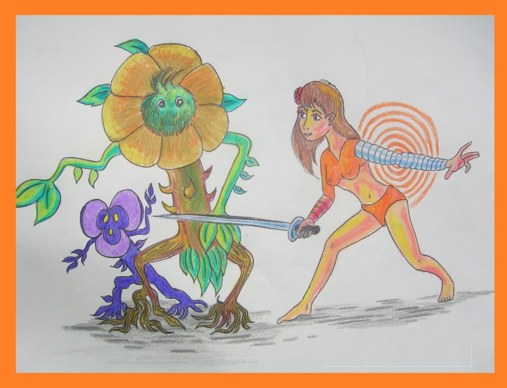The Throckpods connected first with a phalanx of violet flower-people. Violet petals were torn from the faces of the flower-men who barely made a scratch against their weedy attackers. The poor flowers were overwhelmed.