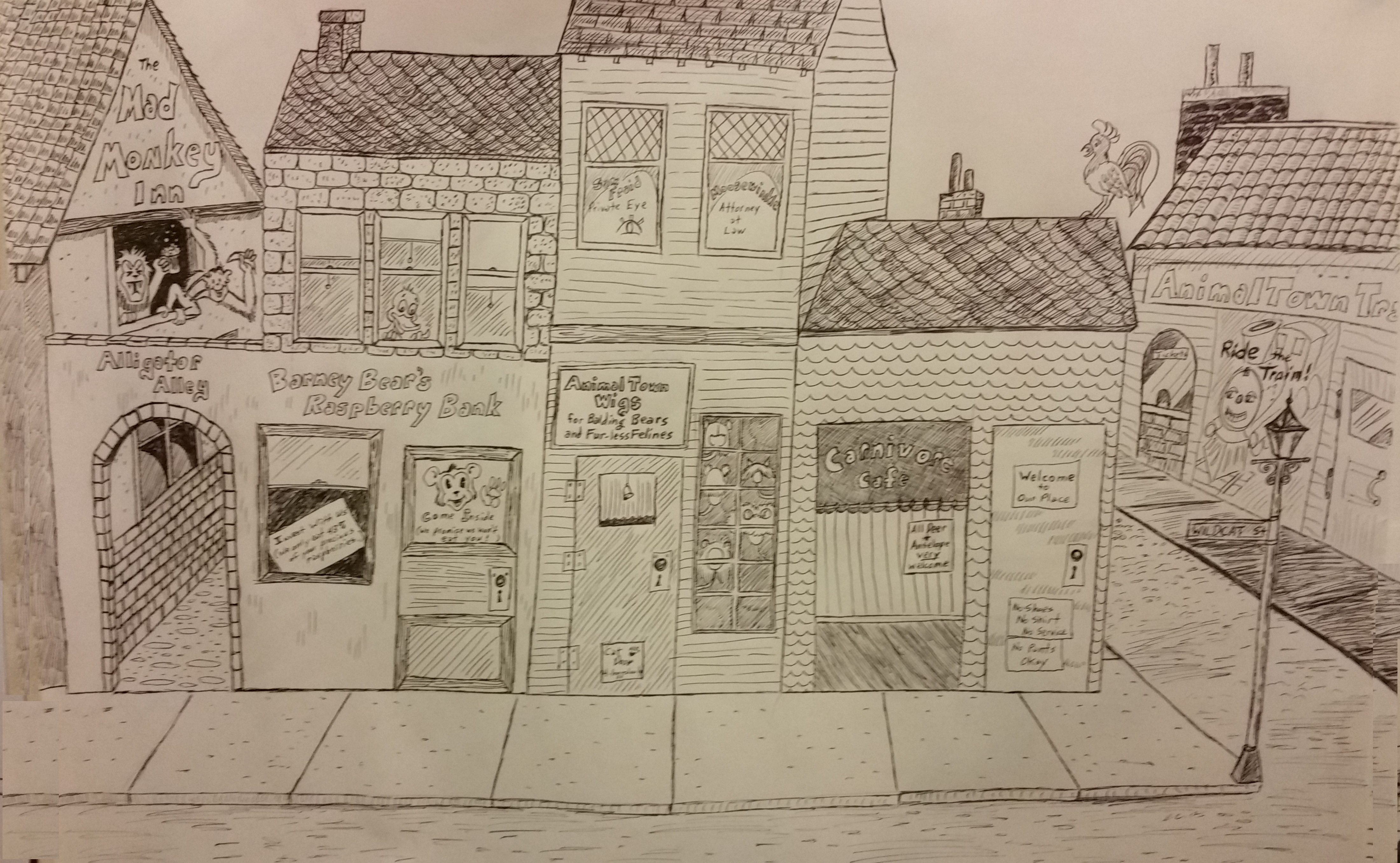 This is a place I explore in cartoons and daydreams. It is a little town known as Animal Town for fairly obvious reasons. It is populated by silly anthropomorphic animals who wear clothes and keep naked people as pets.