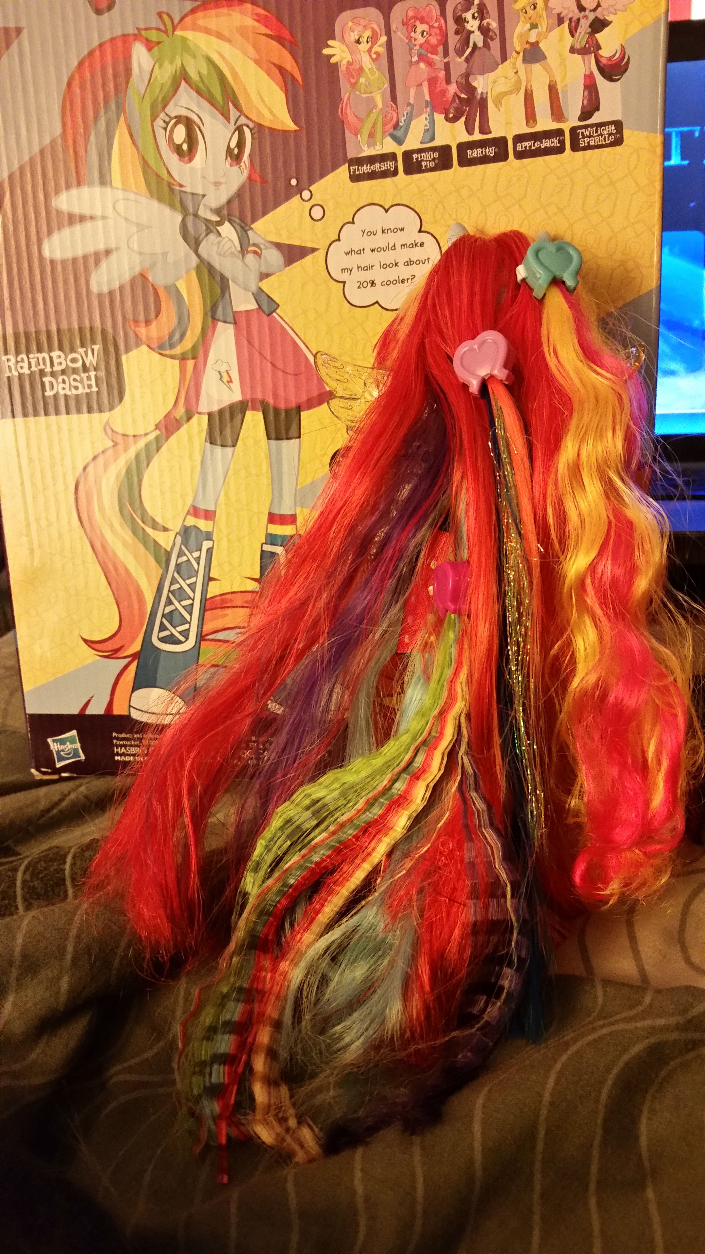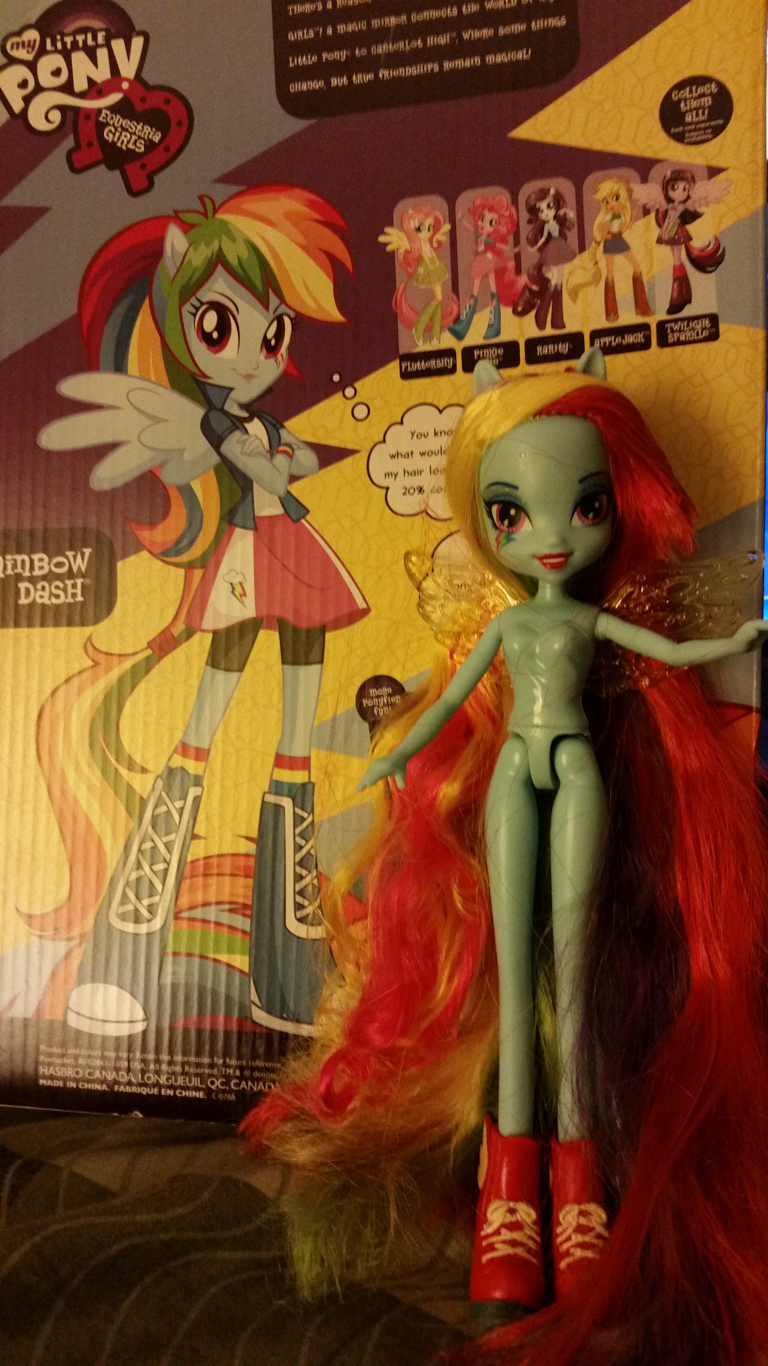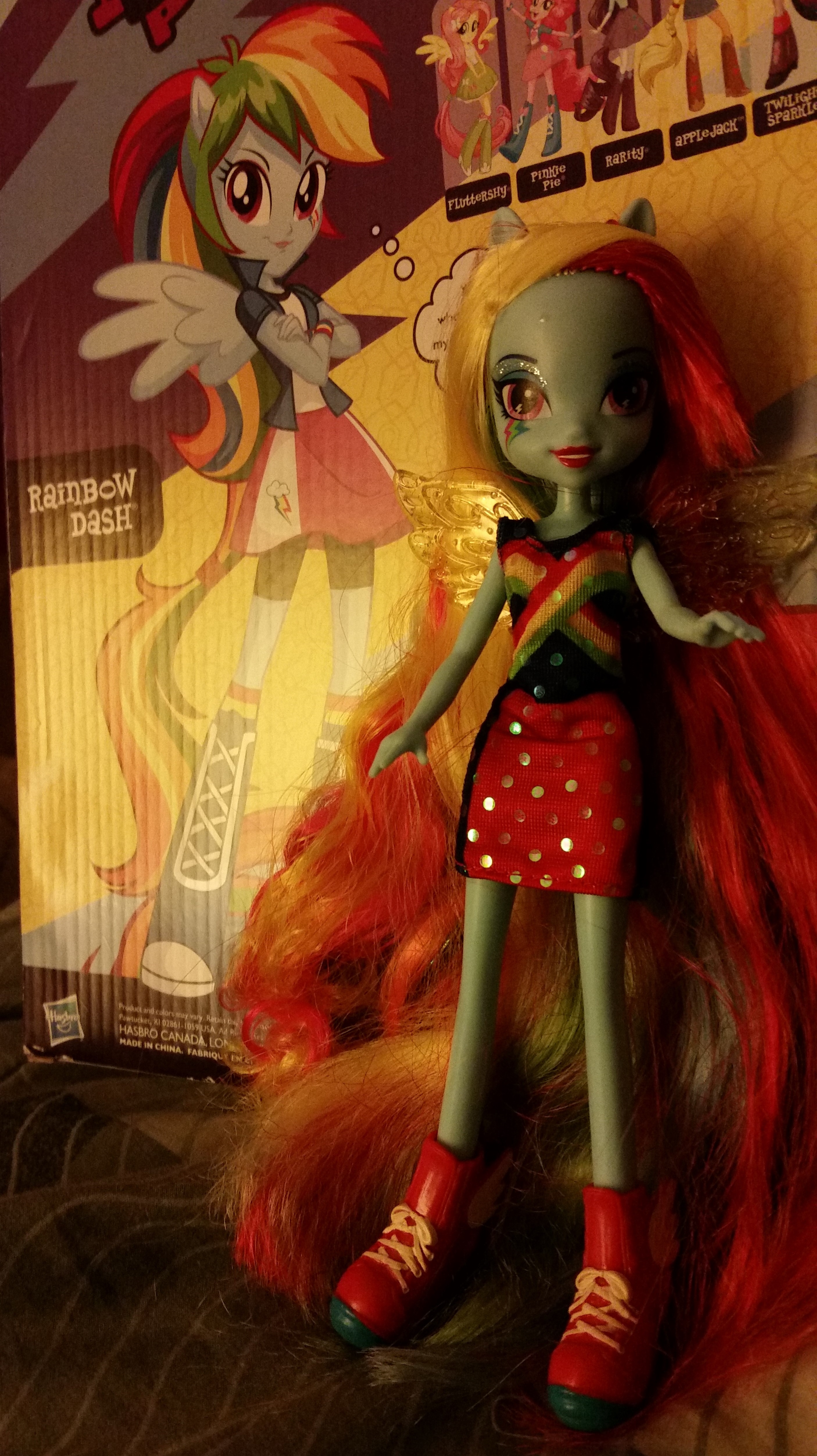 Confession time: It is Rainbow Dash, an Equestria Girl doll. (I know, I know… Mutant My Little Pony critters that have been somehow radioactively transformed into a junior-high-type girl-thing/mutant horror. Complete with radioactively enhanced cuteness genes.) And it was not mint in package (the sacred goal of collectors), it was trash that Wal-Mart sold to me instead of throwing her in the garbage. There was damage to the box as some goofy little girl (or even more worrisome, little boy) had tried to pull out pieces to steal. Unlike Pinkie Pie, though, Rainbow still had all her limbs and accessories. Here she is with a relatively unscathed back of the package.
