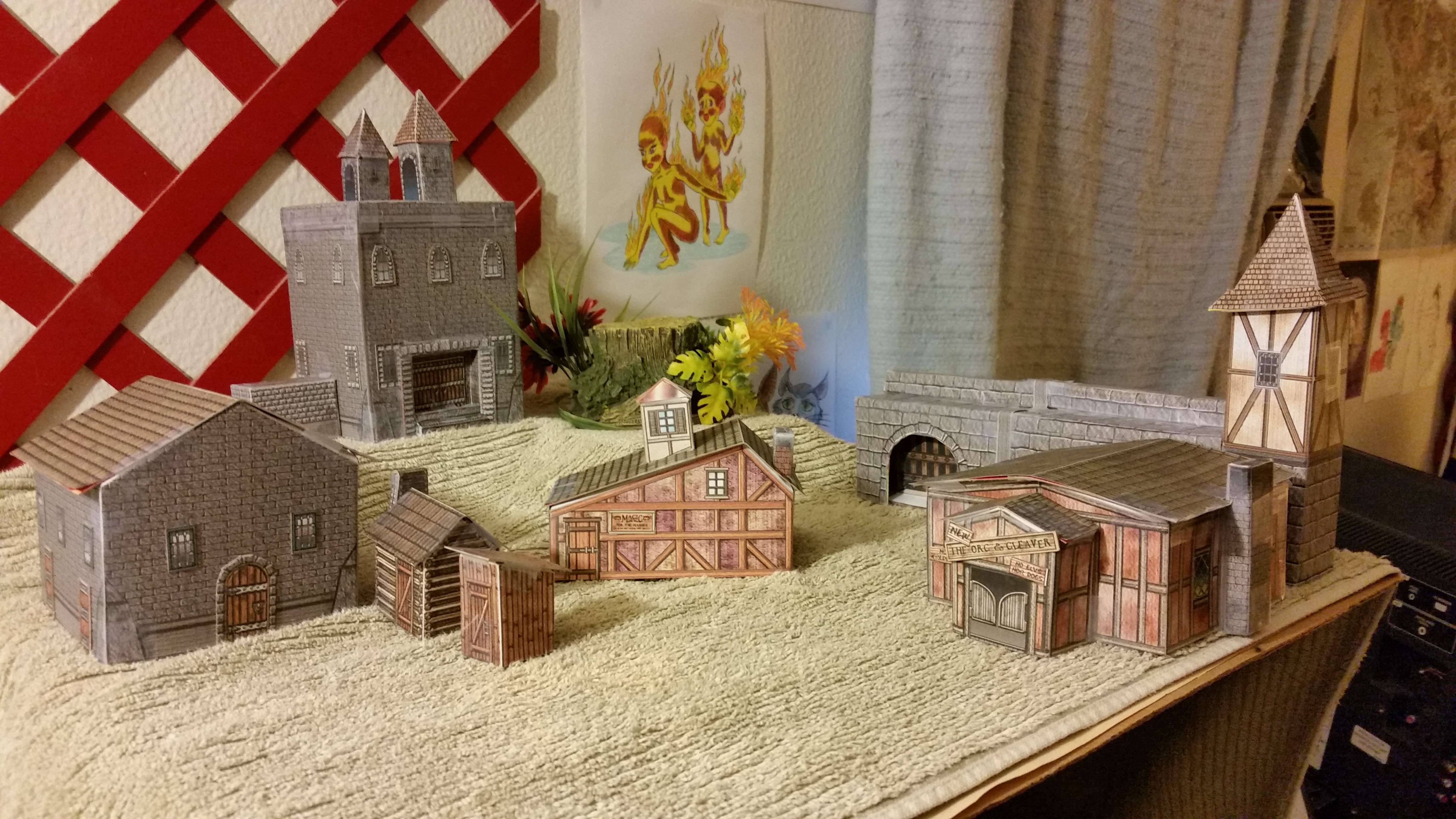 A quick scan of Toonerville along the tops of the bookshelves reveals the full extent of my madness. Here you see HO-sized buildings, most of which I painted myself or built from kits. You also see the Pez dispensers that suck money out of my pockets at $1.50 a shot.