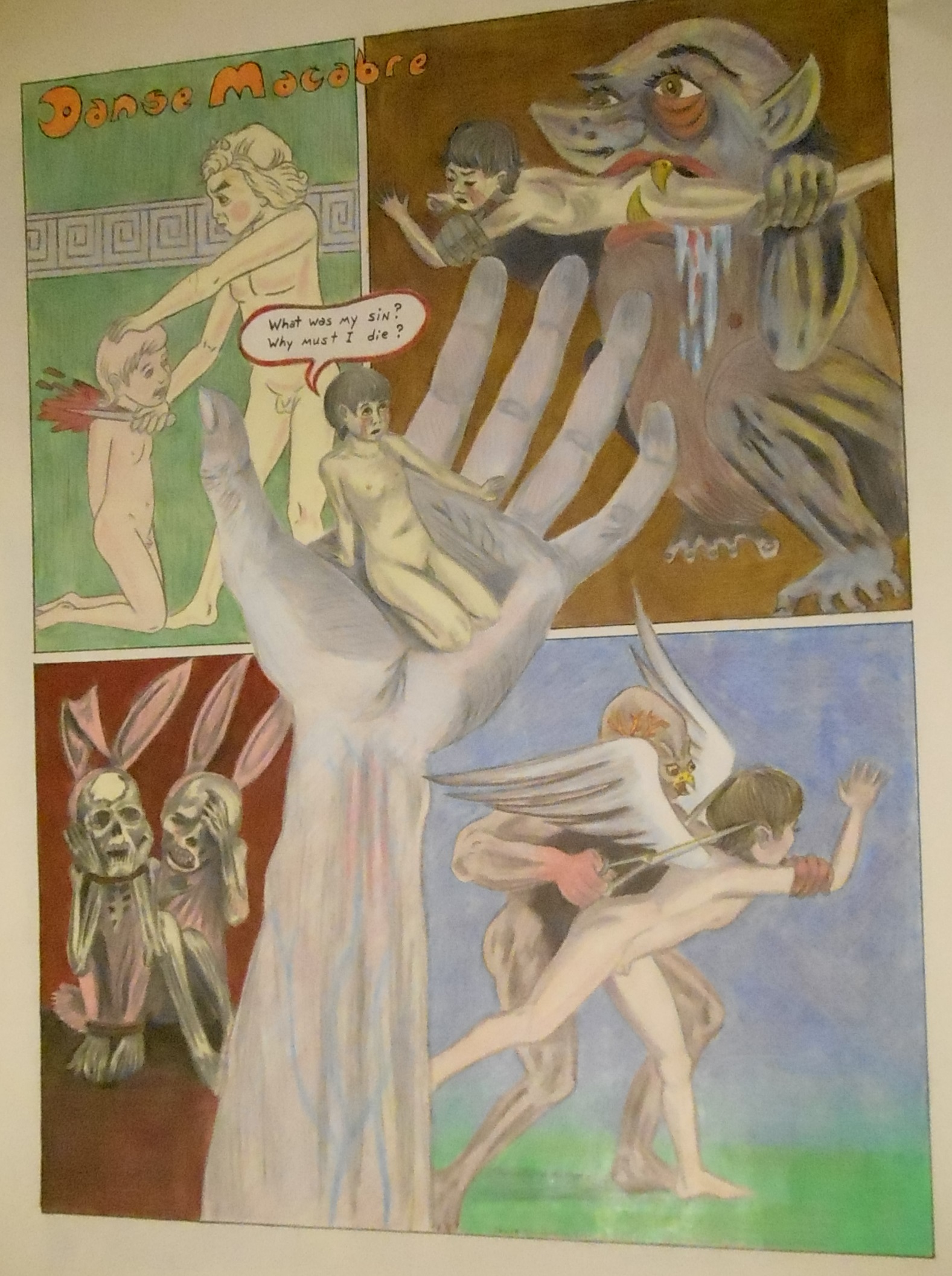 I would like to say going in that there are good reasons why young people can become obsessed with death and suffering and the color black and the dance towards the grave. I danced that jig too when I was younger. At age 22 my experience with sexual assault came back to me in dreams. I thought they were only dream images, but as I continued to think about it and be tormented by it, I began to clearly recall the terrible things he did to me that I had been repressing for twelve years. And I deal with traumatic experience with art for some crazy reason. I took a week in 1981 to get all the horrid feelings out on paper.