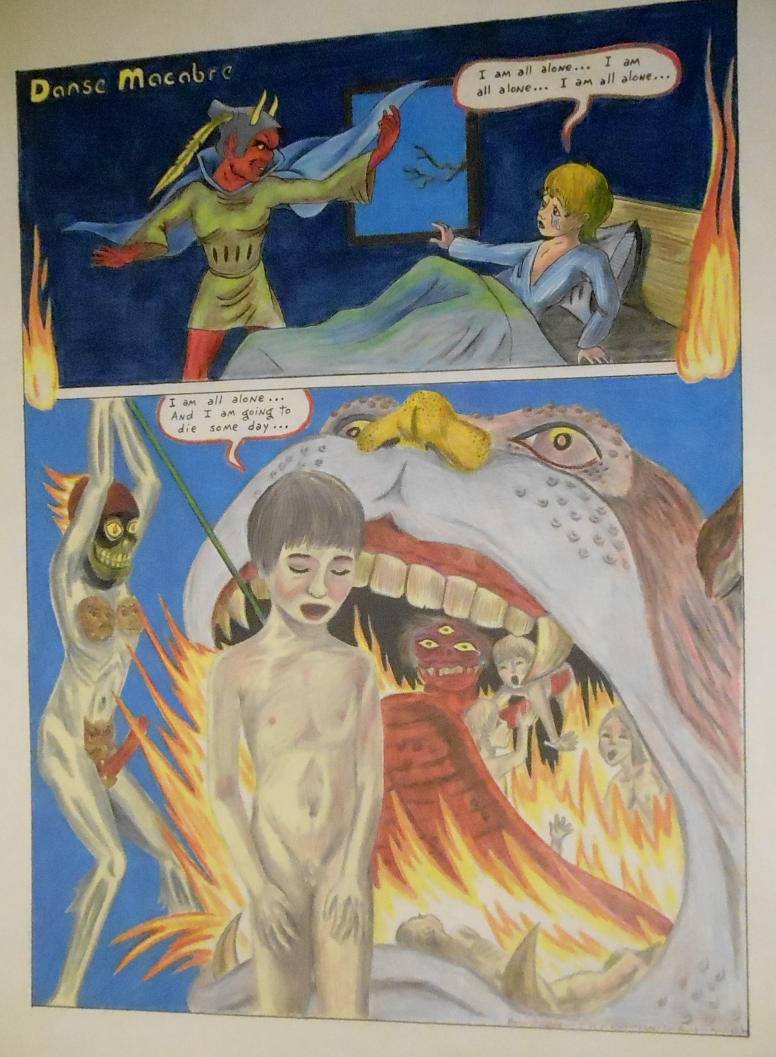 If you are looking at this closely, you will see that I signed my name to it backwards. I signed my art as Leah Cim Reyeb, or simply Leah Cim. I put these four panels into my big black portfolio and never showed them to anybody until after my abuser passed away from a heart attack. I don’t believe in Hell and I don’t believe in ghosts, so now, I finally feel safe about sharing this artwork with others. The terrible secret is a secret no longer. He can no longer reach out and hurt me any further.