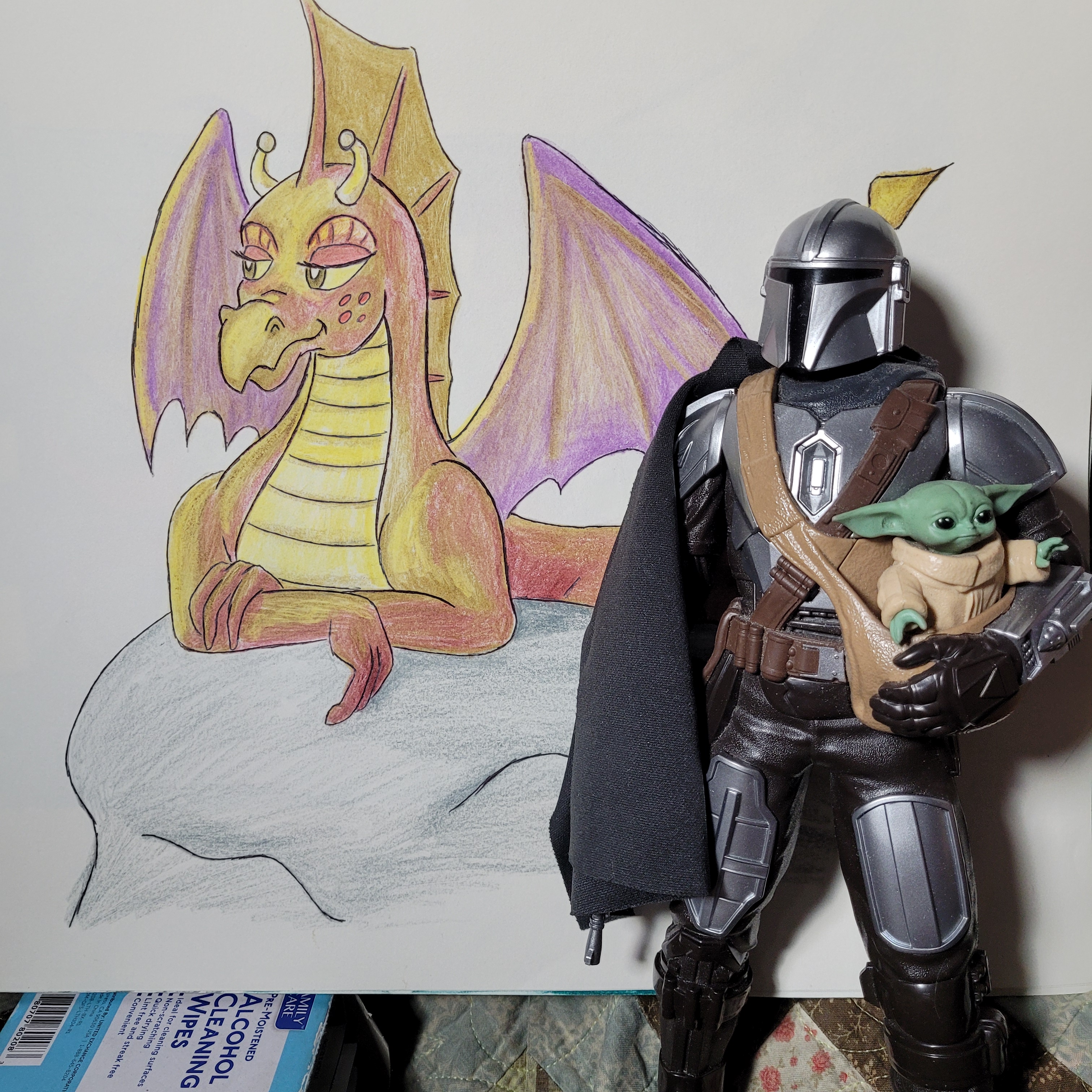 “And, of course, Mickey is such an old coot that soon he will have to decide to reduce or eliminate his doll collection to go live with his sister in Iowa as he gets older and stupider and cootier while waiting to die. The Mandalorian with Baby Yoda Grogu is one of the last dolls bought by Mickey. Possibly the last one ever. But all good things come to an end. Thankfully, so do bad things. The rubber band has to snap back to small.”