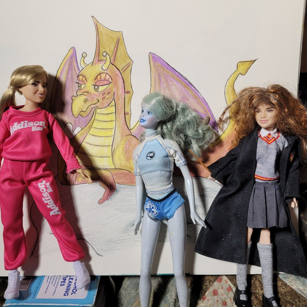 “In the above picture, you see an Addison Rae doll from the Walmart Clearance shelves ($5.) The blue Barbie (probably a fairy with wings) cost fifty cents at Goodwill naked, and now she wears the swimsuit of a $5 Summer Surfer Barbie. The third doll is Hermoine from the Harry Potter series for $14.”