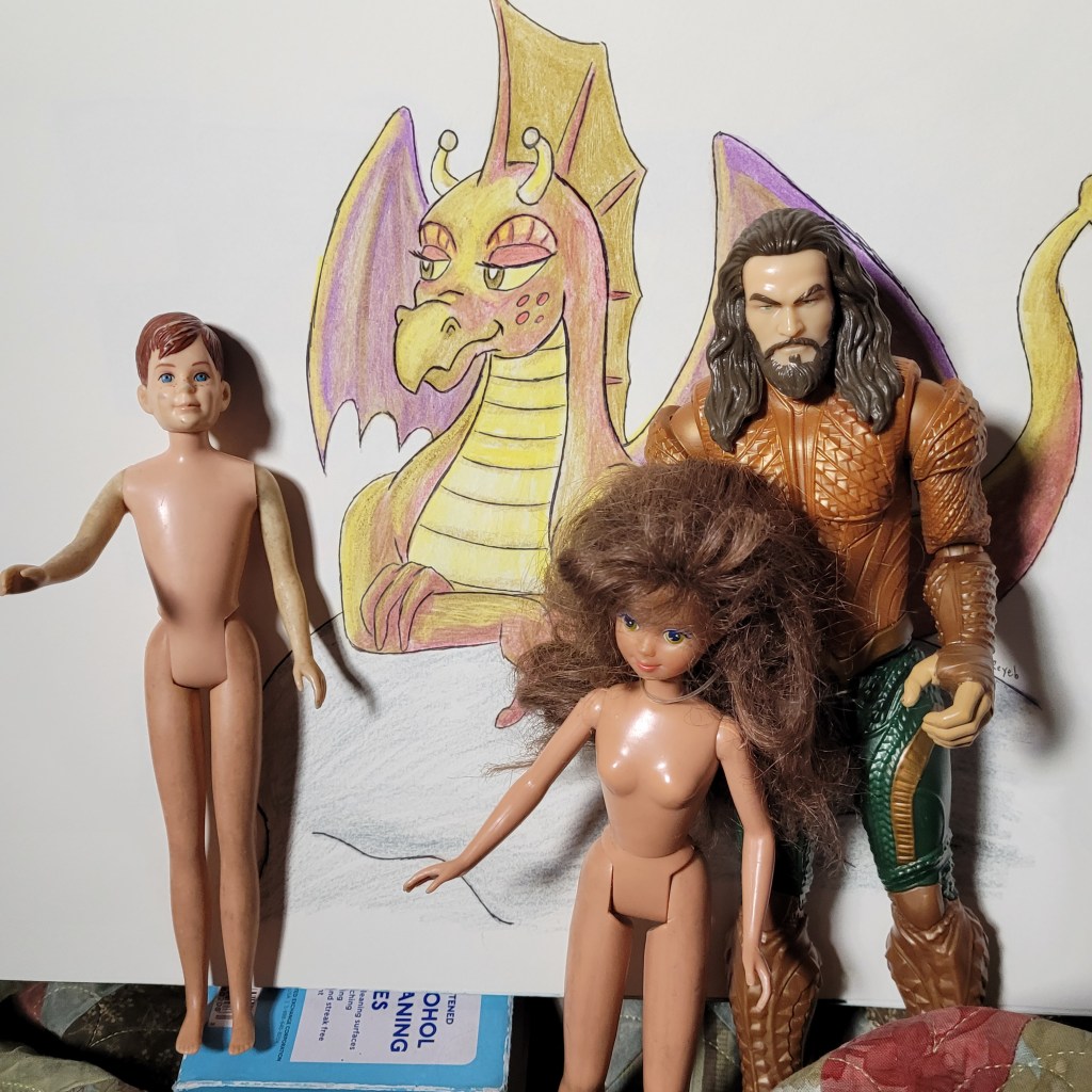 “Some dolls in the collection are nudists. Ricky, a Barbie child from the 60s, cost Mickey $12 on E-bay. Any wearable clothing from the same period was more than twice what the doll cost… just for pants! Tammy, another old doll bought from the fifty-cent bin at Goodwill, could only fit rare Skipper and Francie togs that were way too costly. So, nudists! They have not worn any clothes for the ten years Mickey has owned them both. Aquaman here is also nude and his clothing is carved right on his skin. He cannot wear clothes made of cloth.”